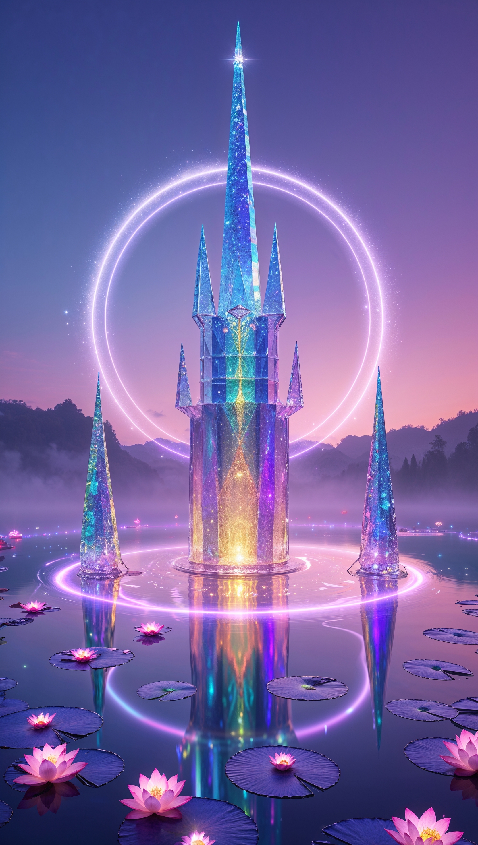 1664x2944 Tower of magic rising from a glowing lake, fantasy surreal style