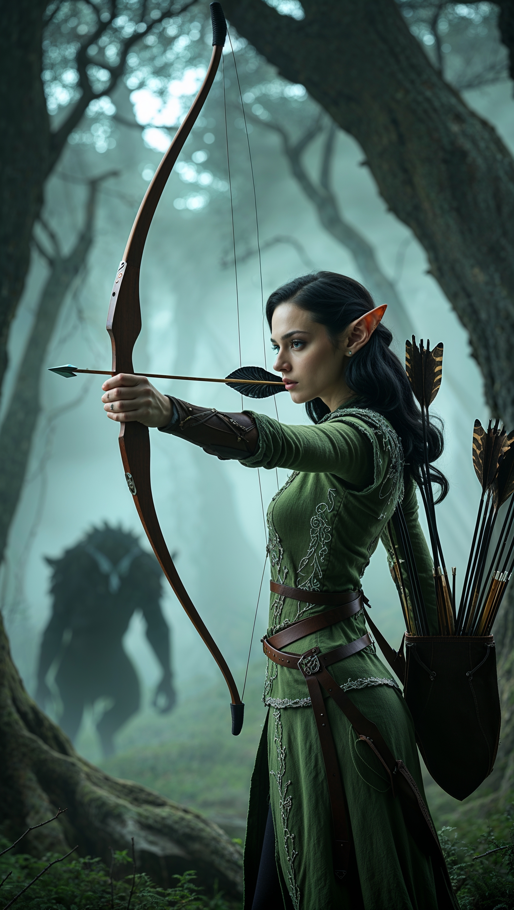1664x2944 Elven archer in the woods aiming at a shadow creature