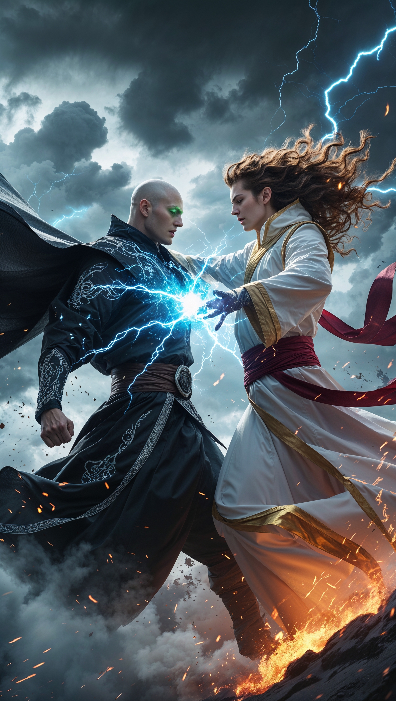 1664x2944 Two mages dueling in a stormy sky, lightning and energy blasts