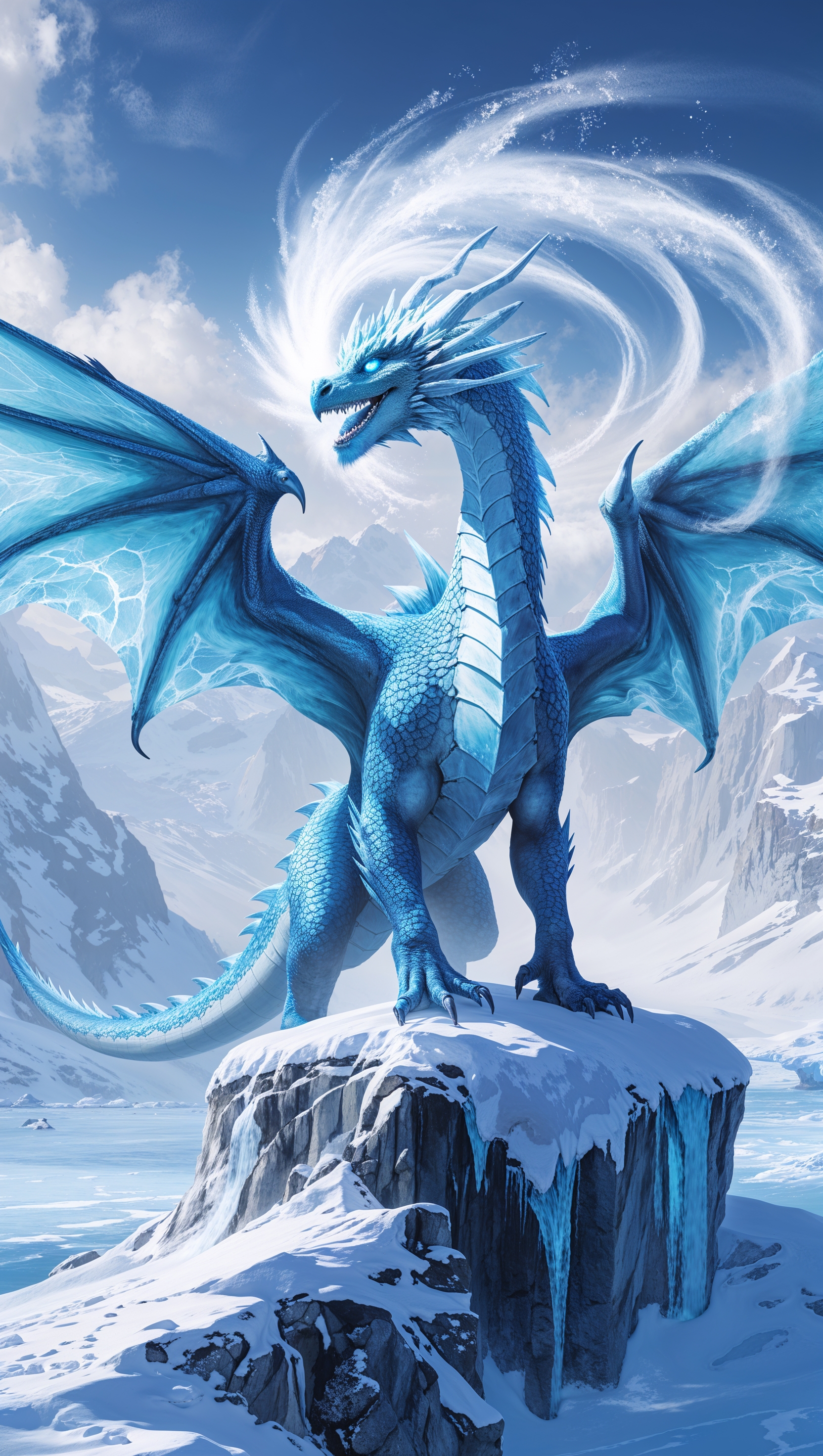 1664x2944 Ice dragon breathing frost in a frozen valley, blue and white color scheme