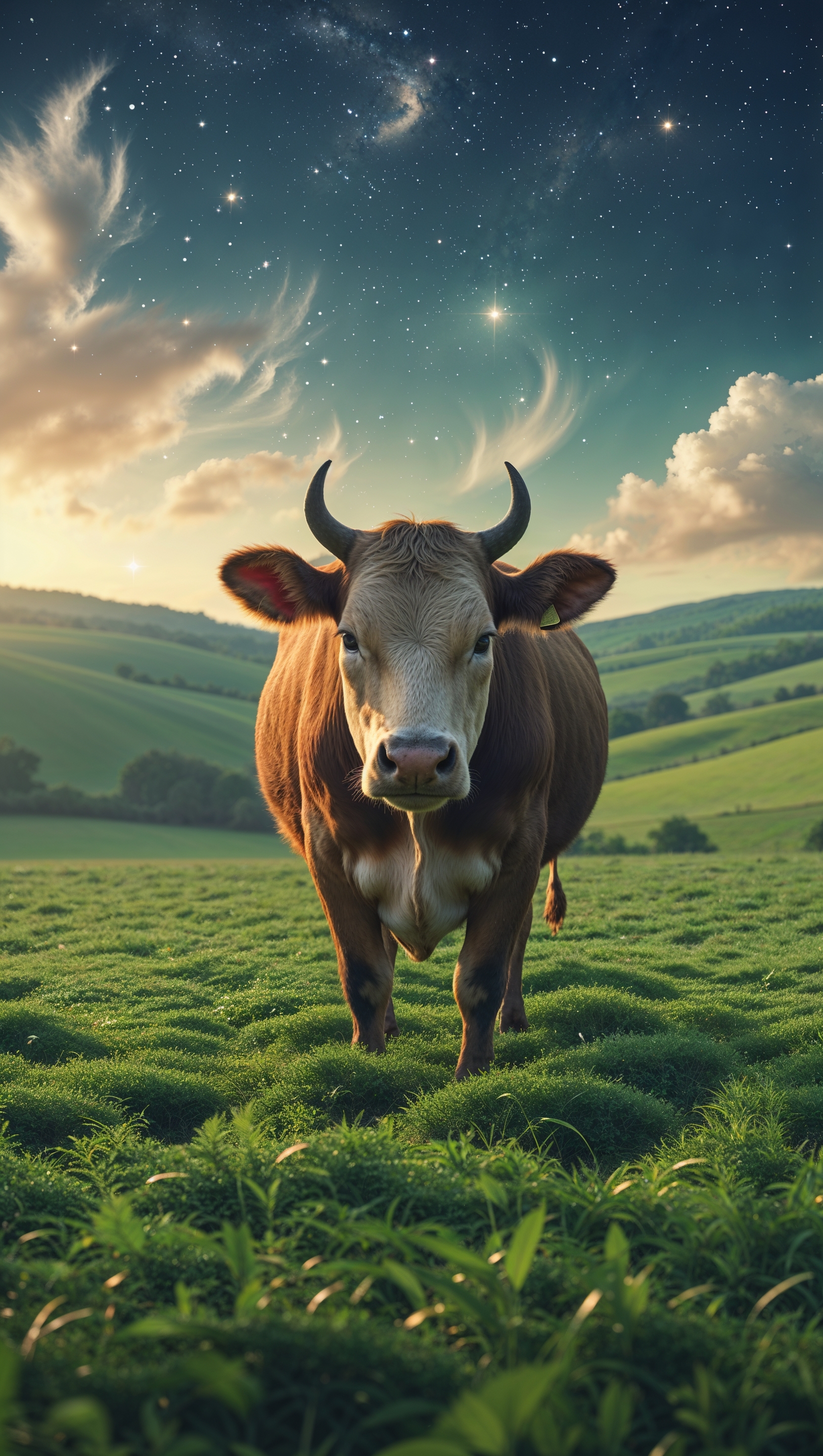 1664x2944 An image of a cow in vast fields with a starry sky for an iPhone wallpaper
