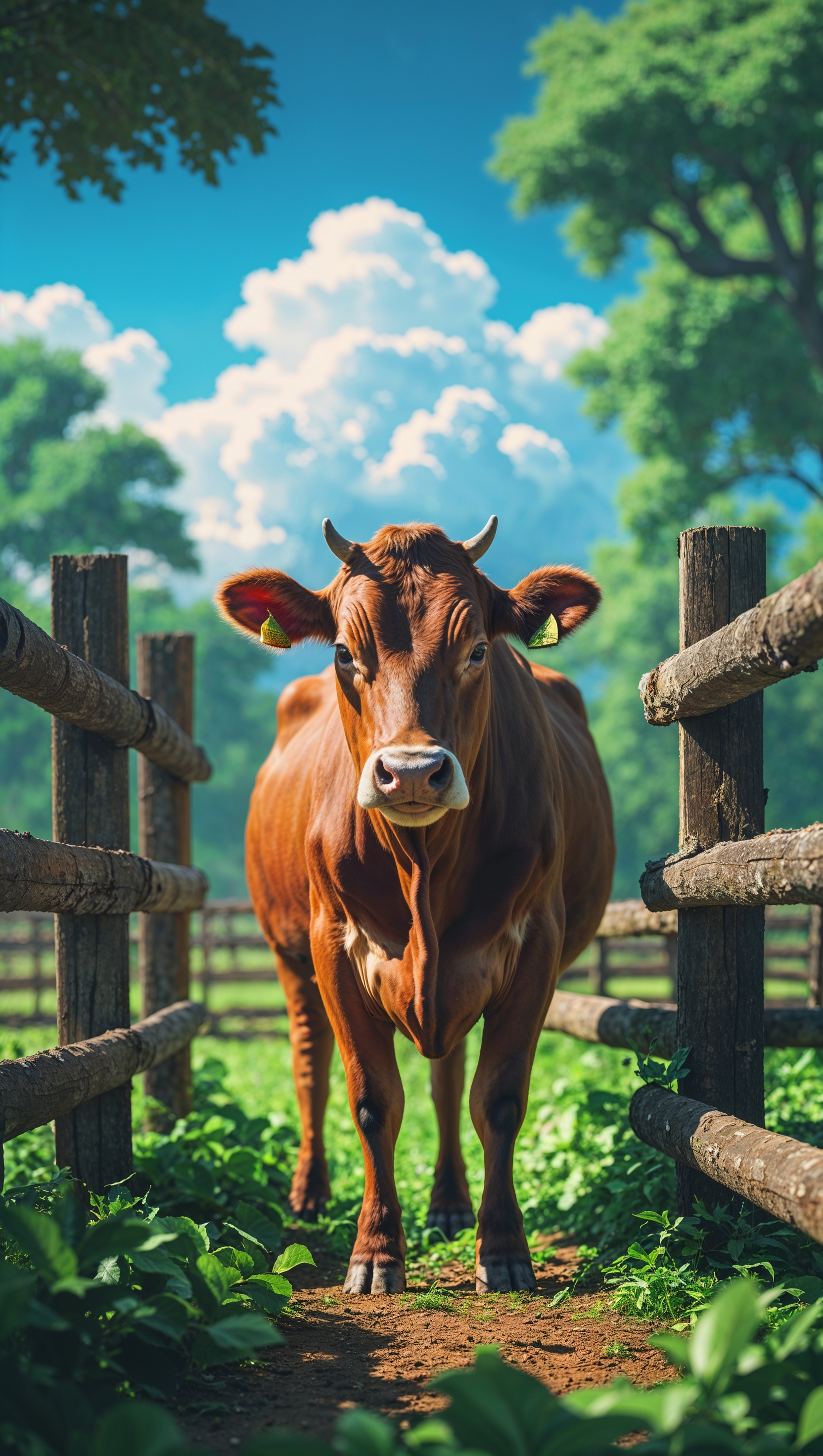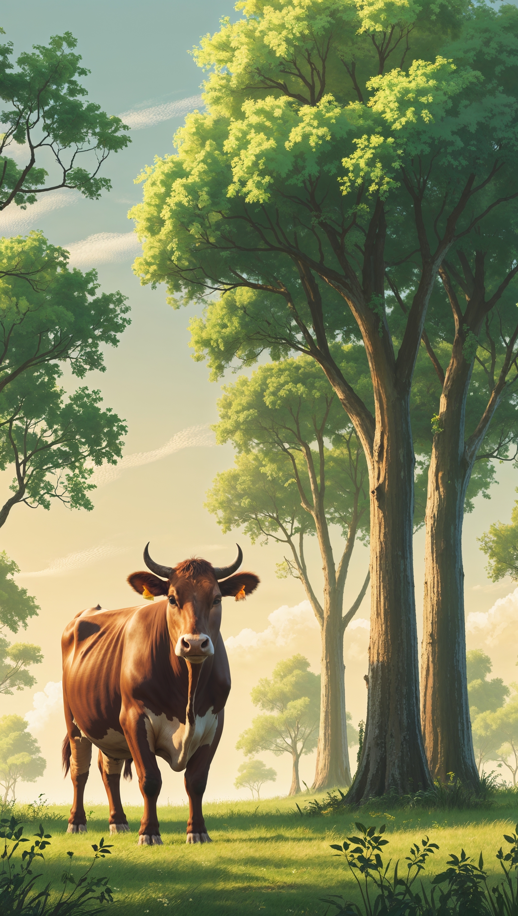 1664x2944 An artistic image of a cow in a farm with a blue sky and white clouds for an iPhone wallpaper