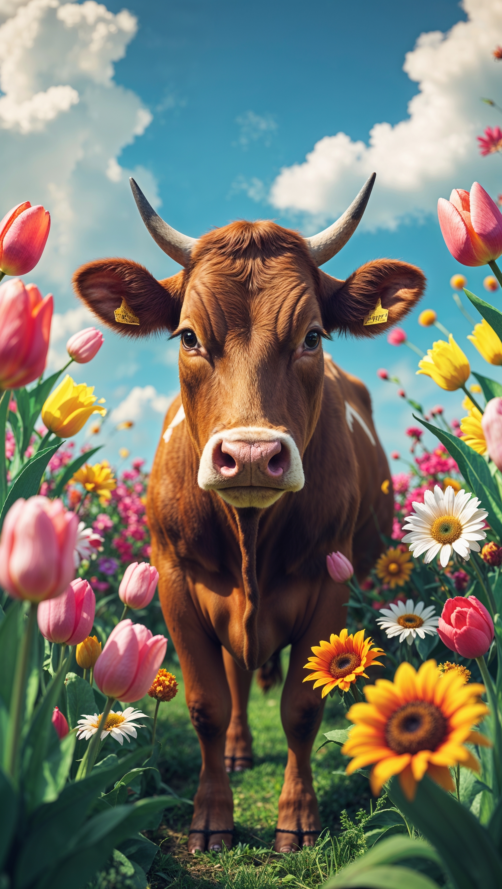 1664x2944 A cow in a farm with colorful flowers around it for an iPhone wallpaper