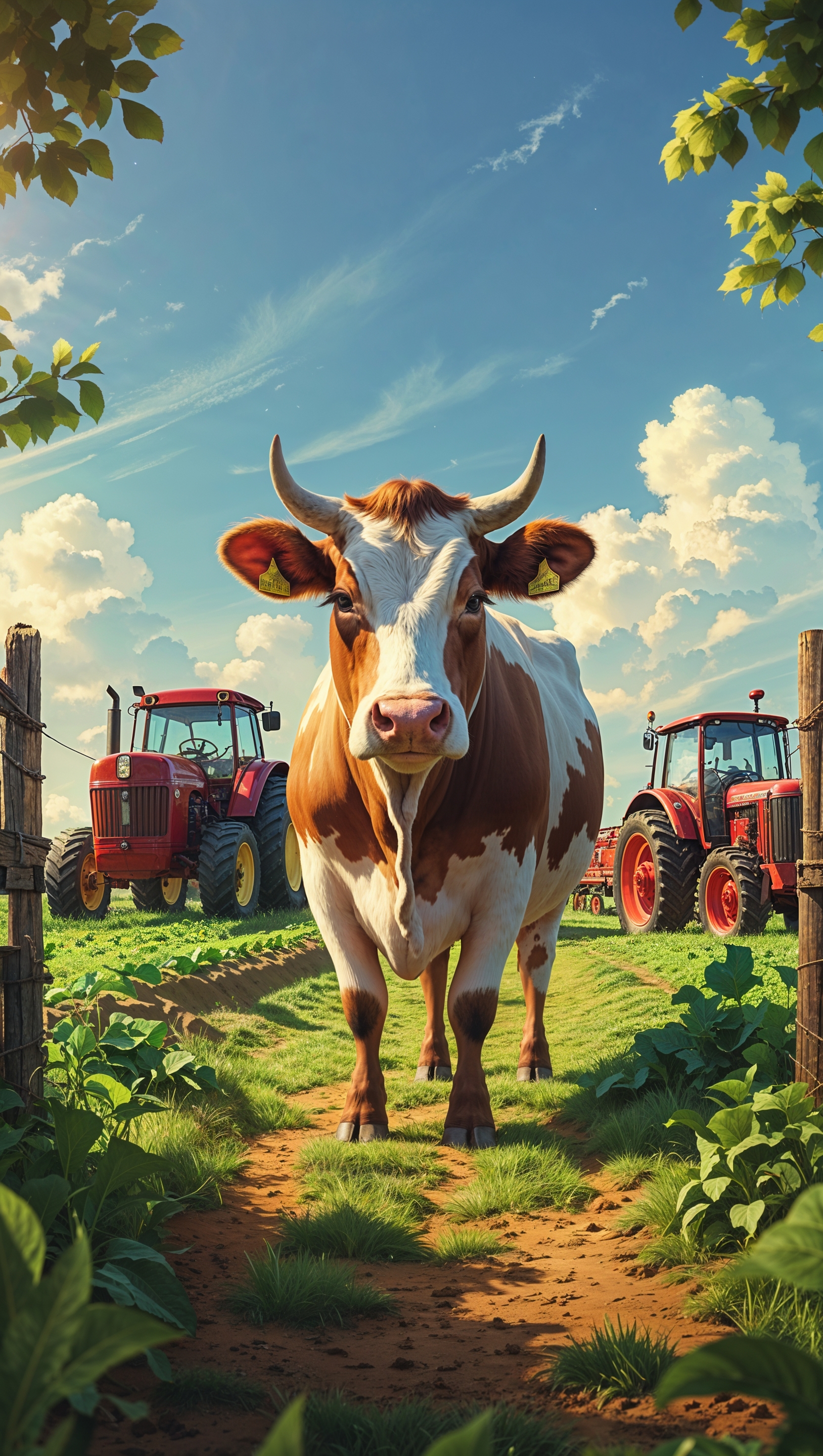 1664x2944 A cow in a farm with a tractor and farming machines for an iPhone wallpaper