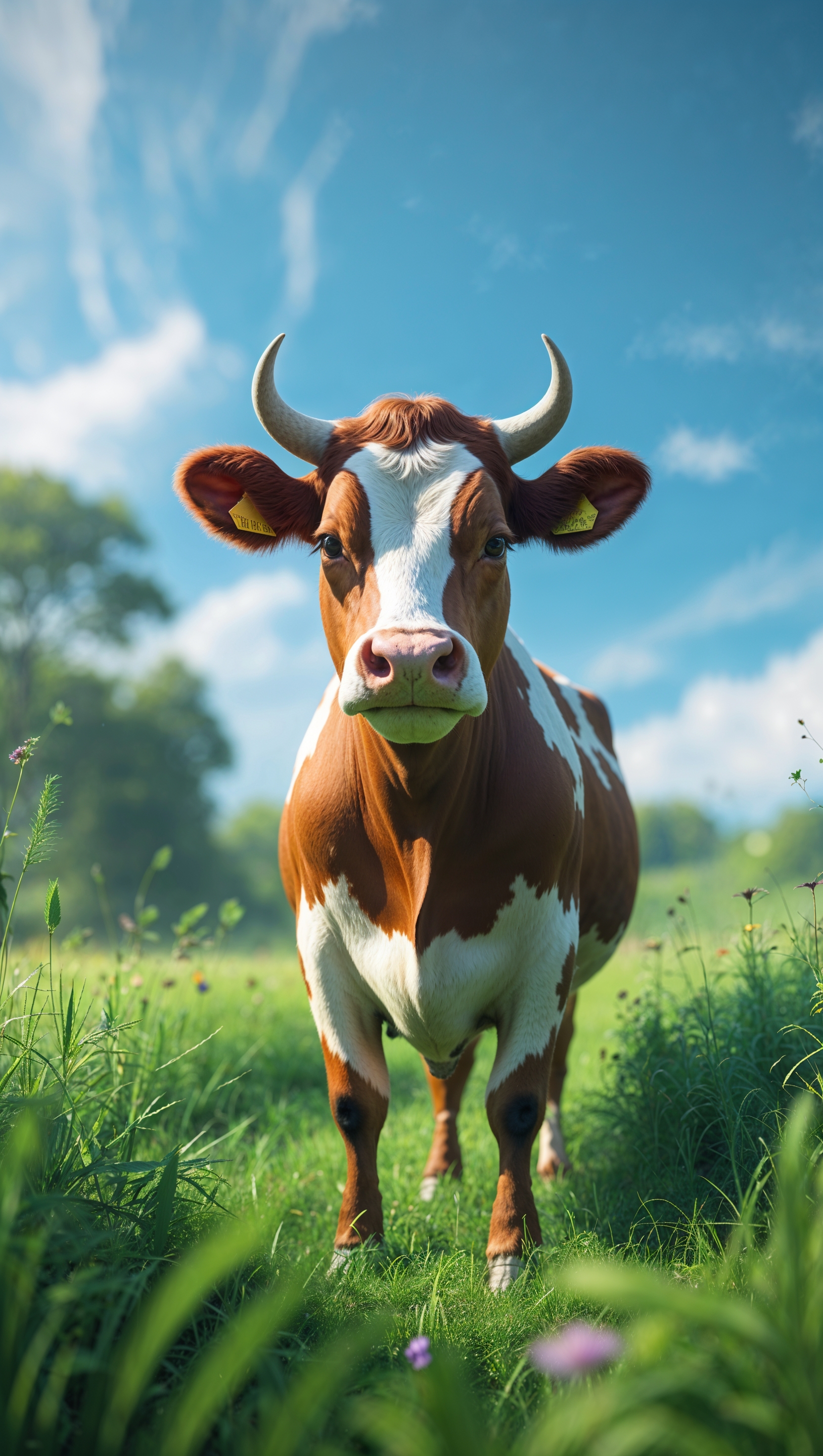 1664x2944 A cow in the middle of a vast farm with green pastures and a blue sky for an iPhone wallpaper