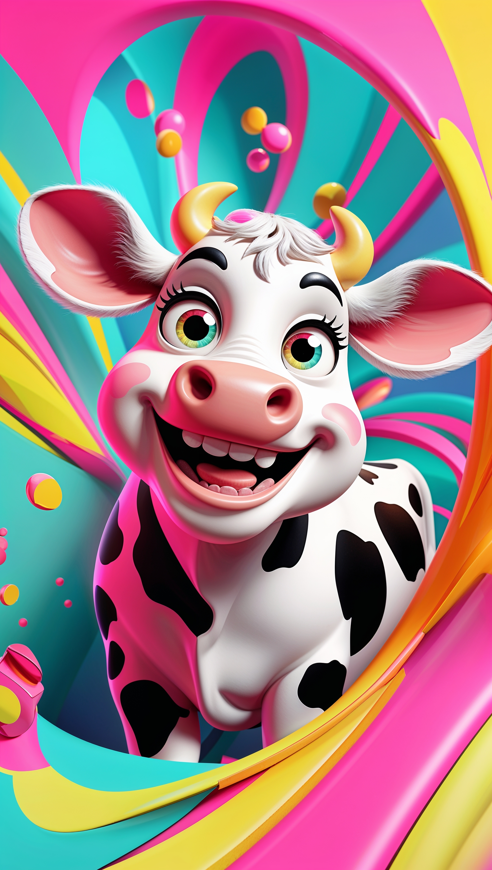 1664x2944 A cartoon cow with a big smile and a colorful background for an iPhone wallpaper