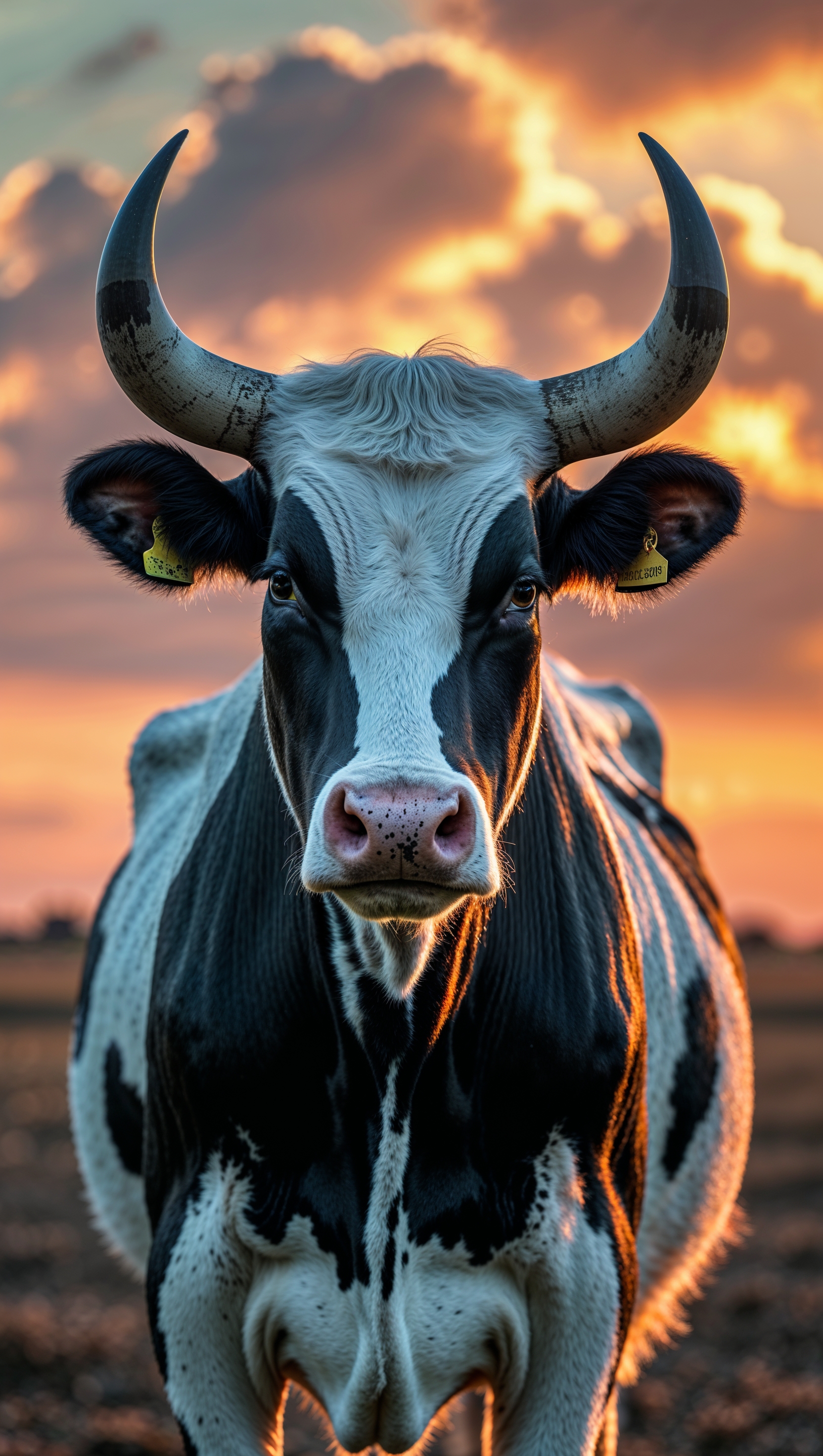 1664x2944 A black and white cow with a sunset background for an iPhone wallpaper