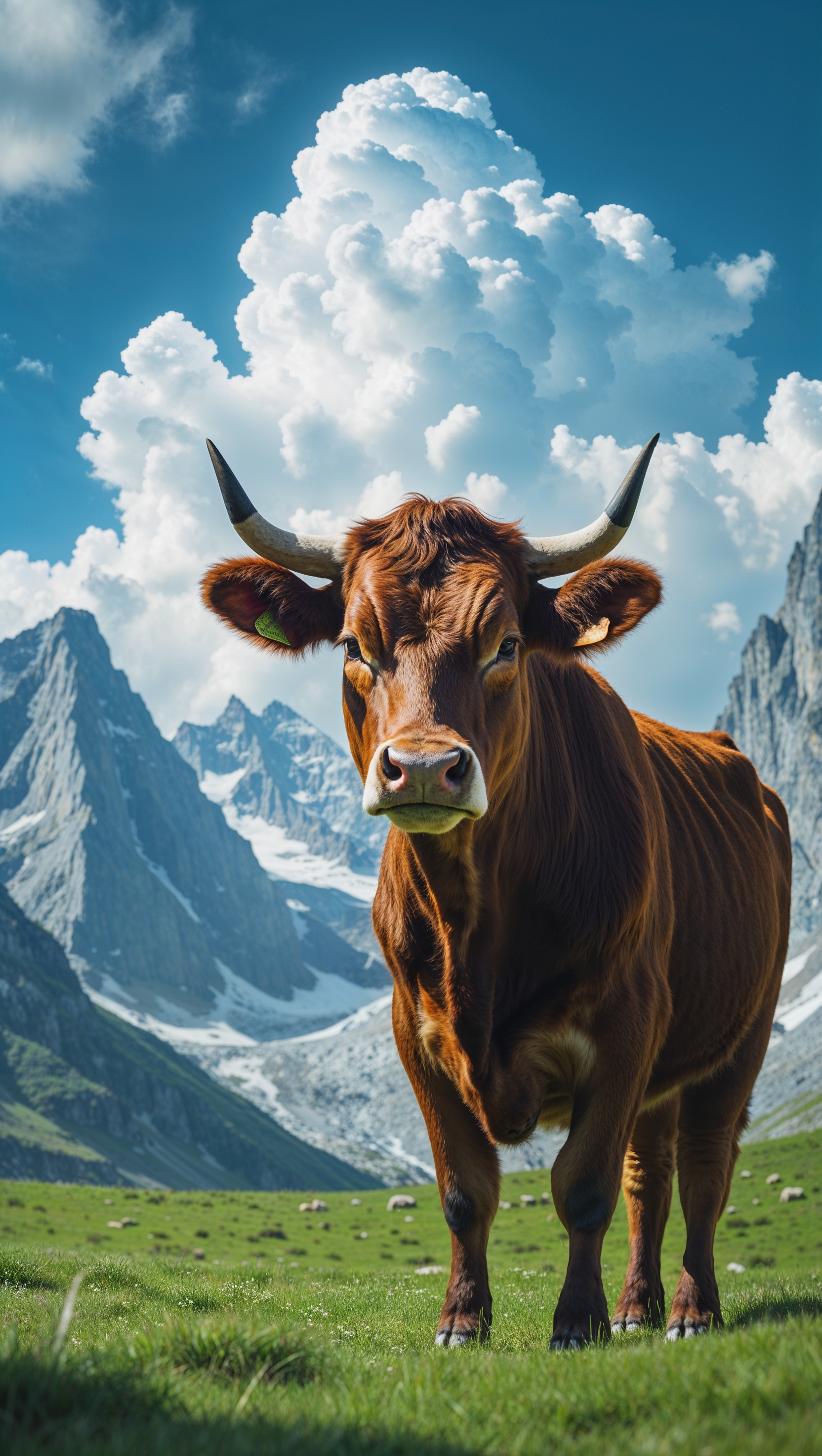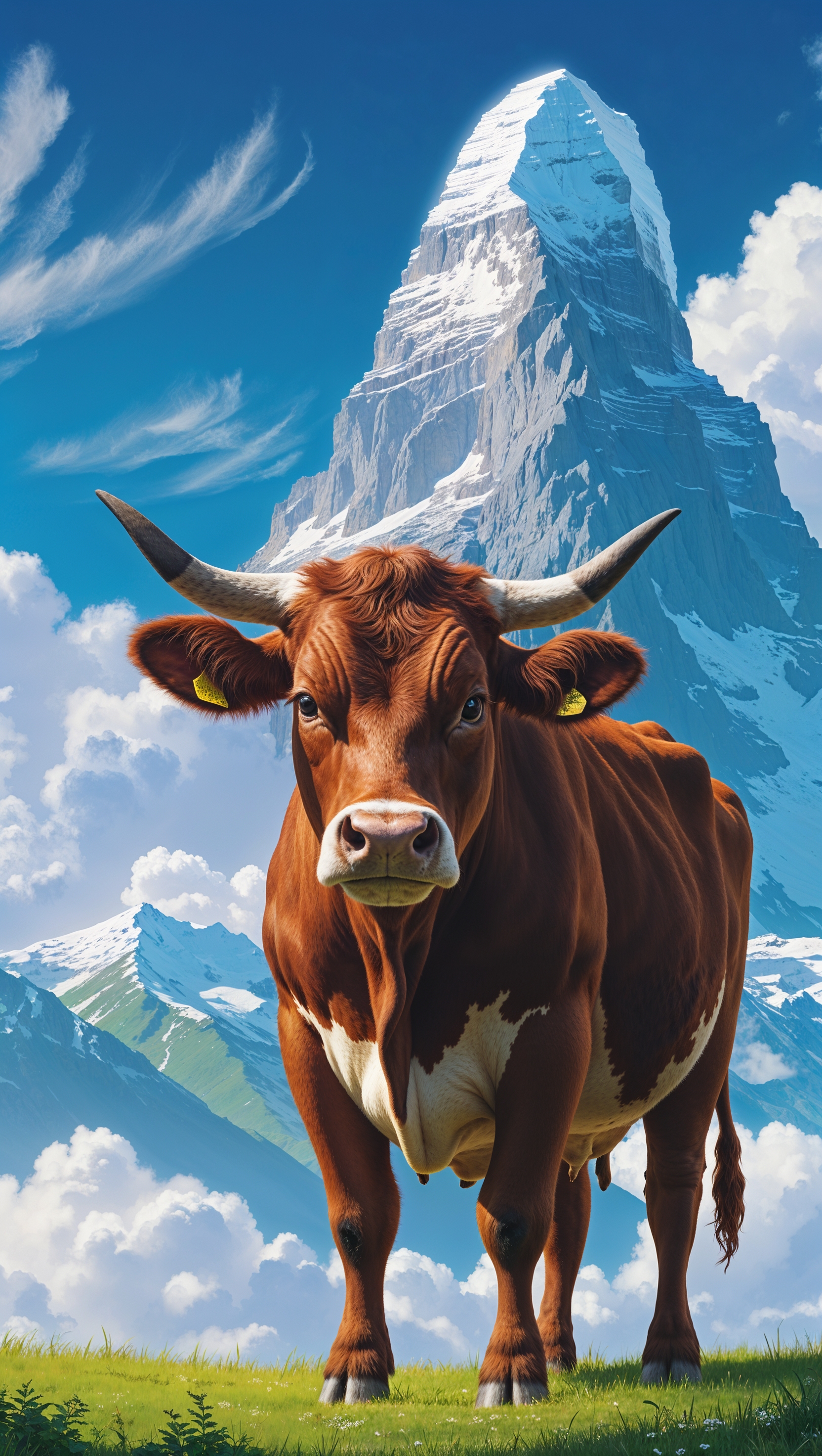1664x2944 A cow next to a tall peak with a blue sky and soft clouds for an iPhone wallpaper