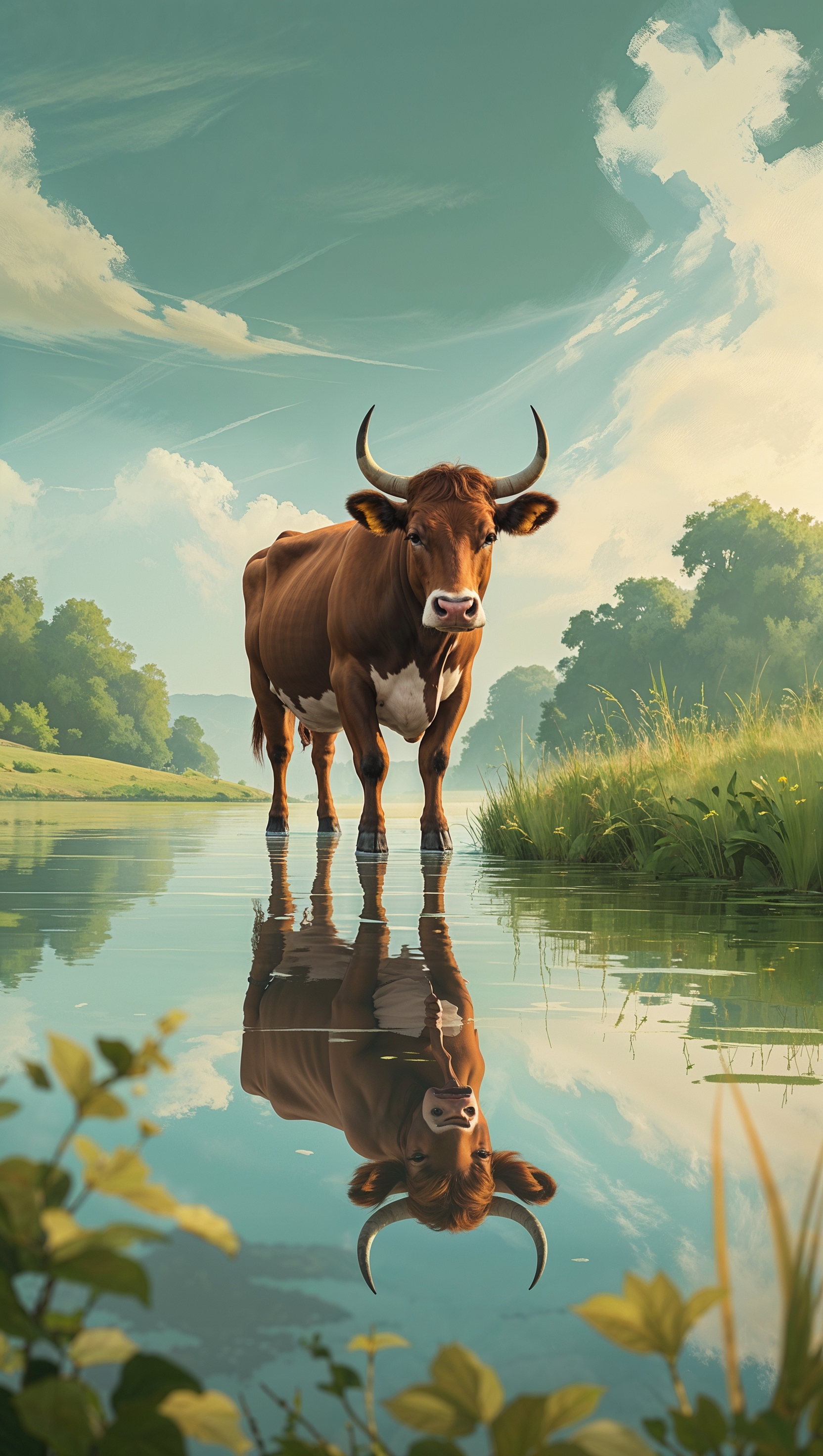 1664x2944 A picture of a cow by a calm lake with its reflection in the water for an iPhone wallpaper
