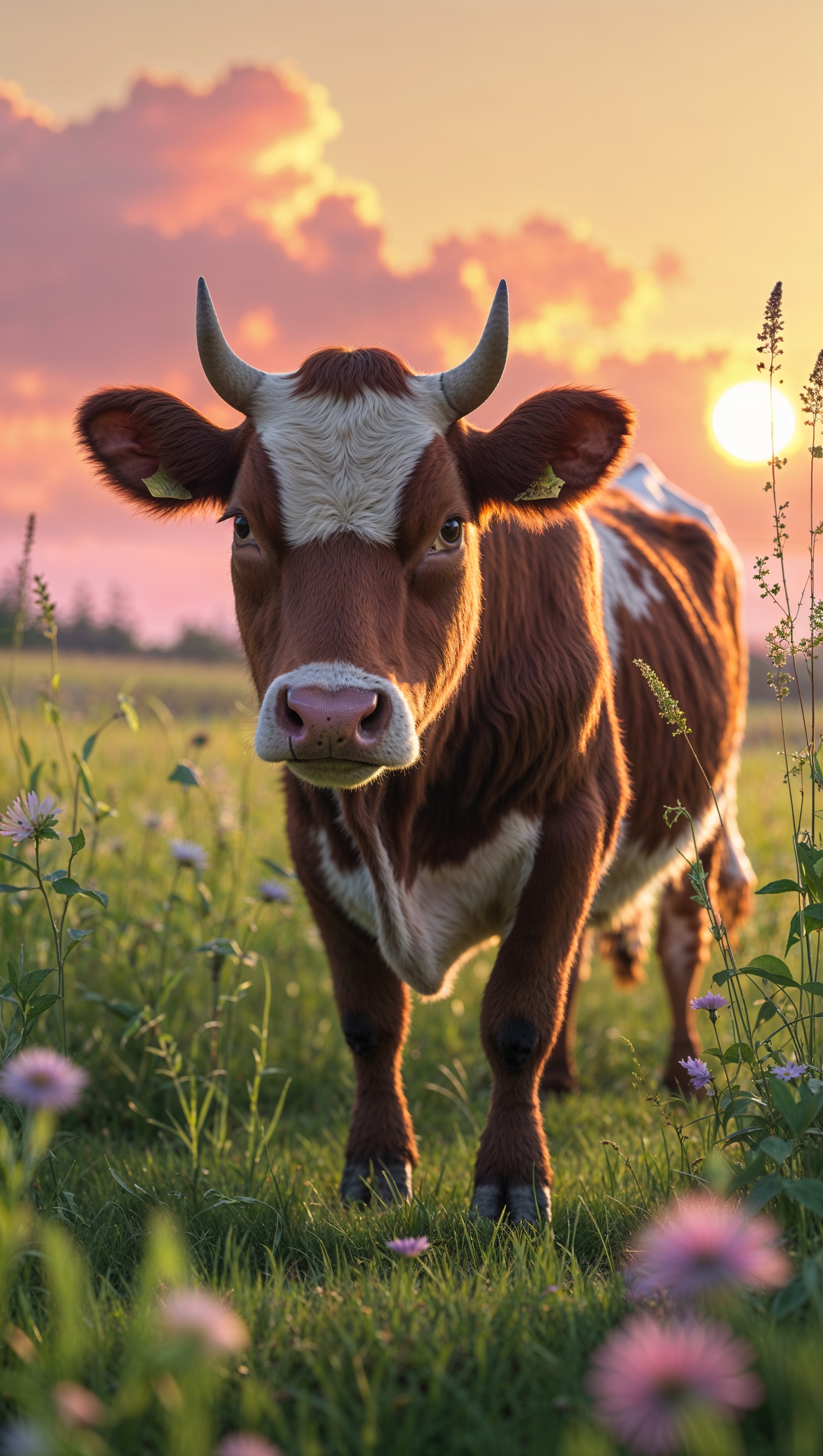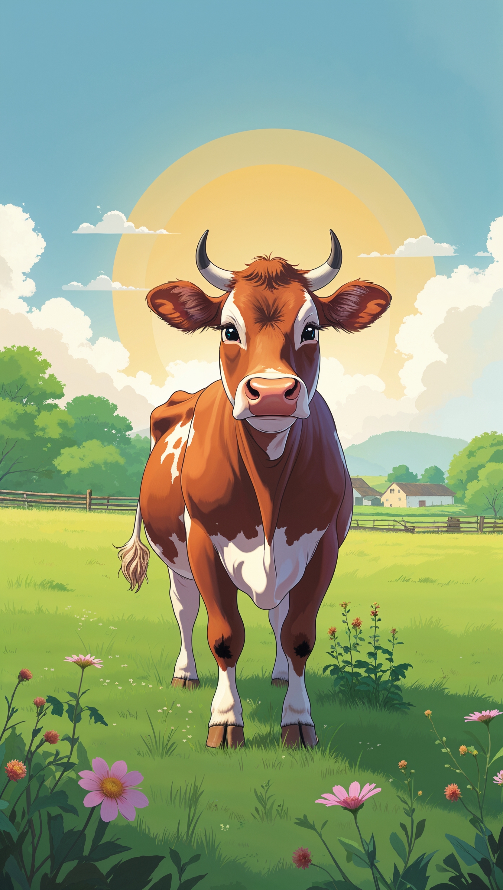 1664x2944 An image of a cow in a farm next to a warm sun and pleasant weather for an iPhone wallpaper