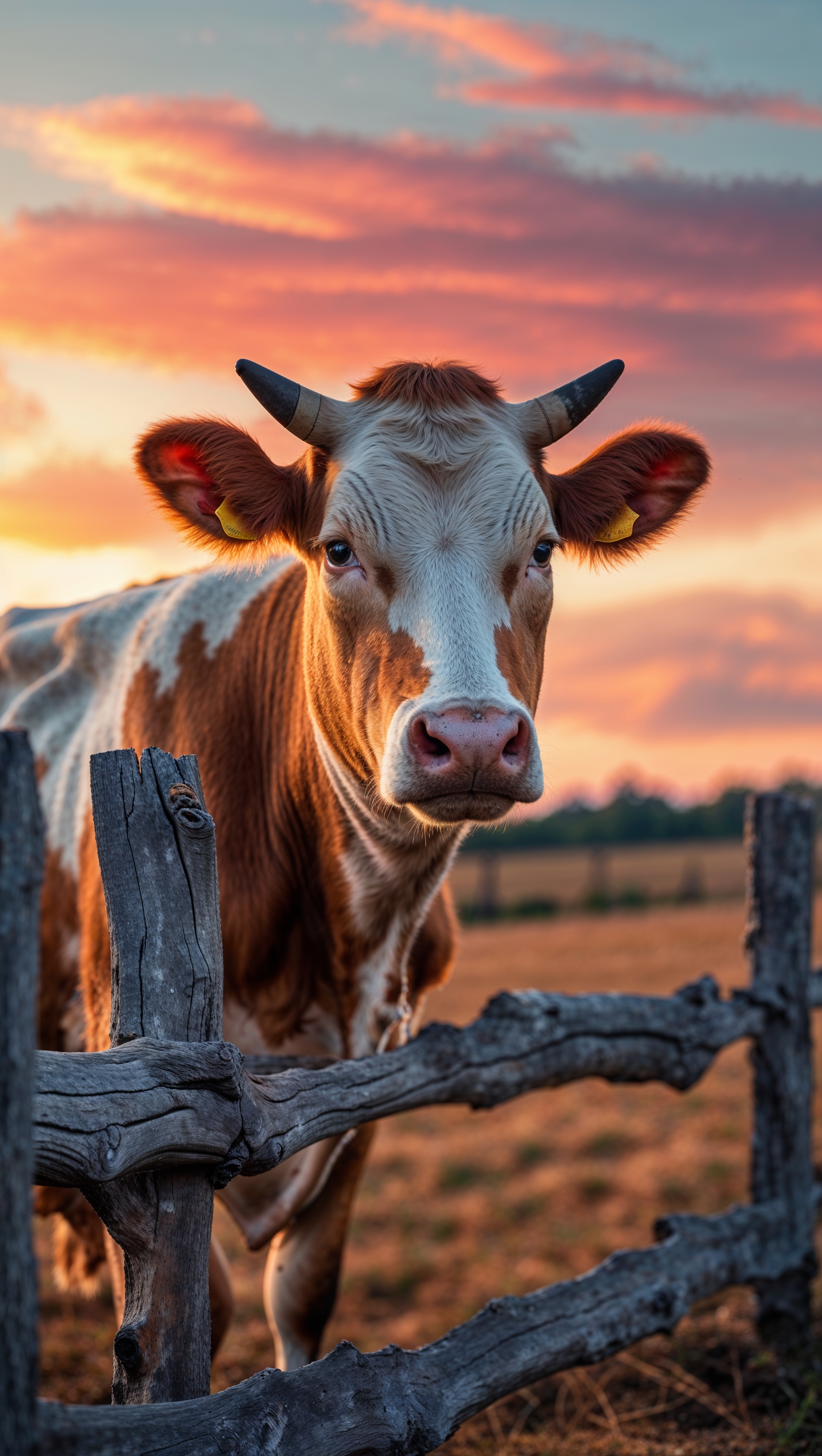 1664x2944 A cow next to a wooden fence with a sunset sky and beautiful colors for an iPhone wallpaper