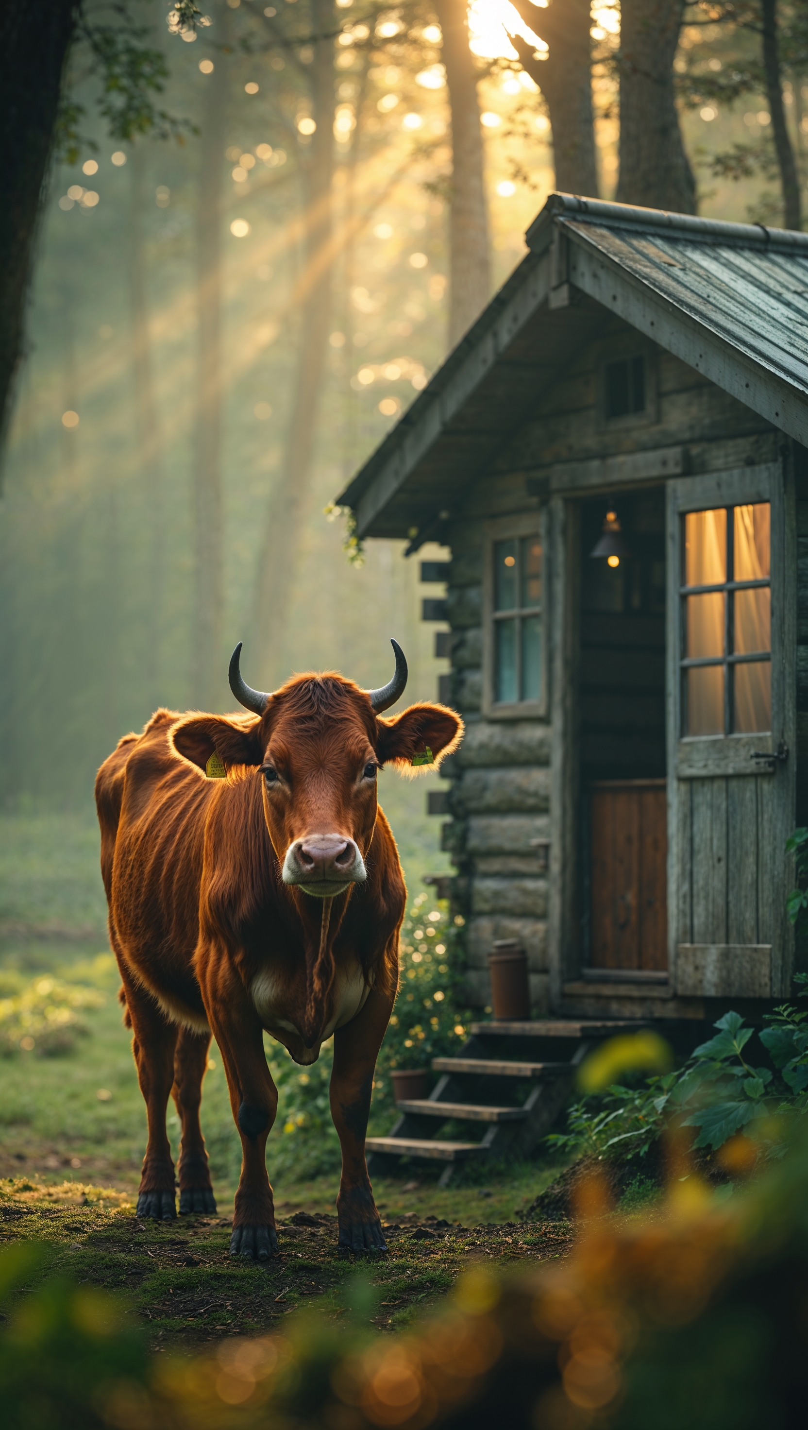 1664x2944 A cow next to a small wooden cabin in the forest for an iPhone wallpaper