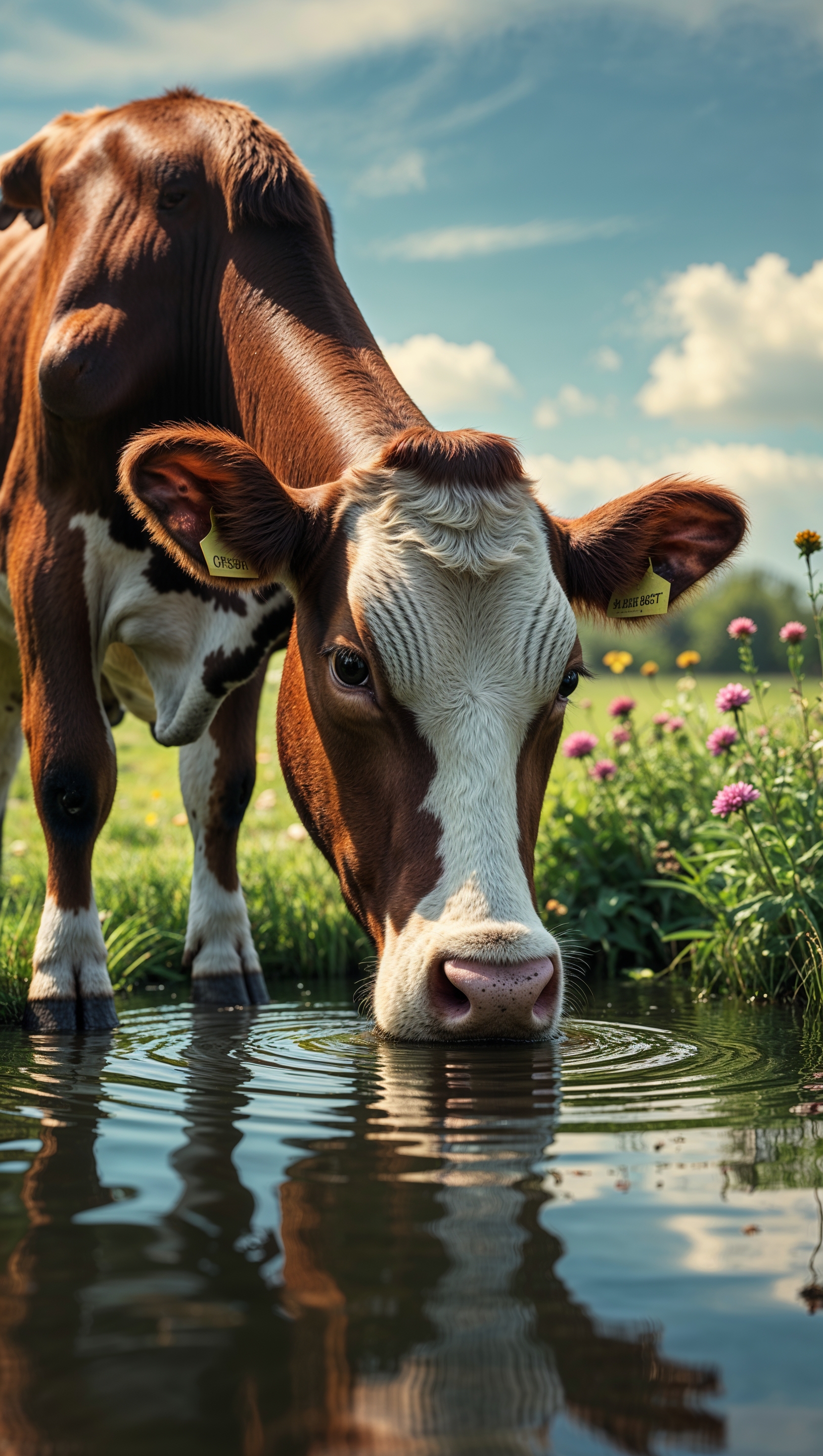 1664x2944 A cow drinking from a small pond in nature for an iPhone wallpaper
