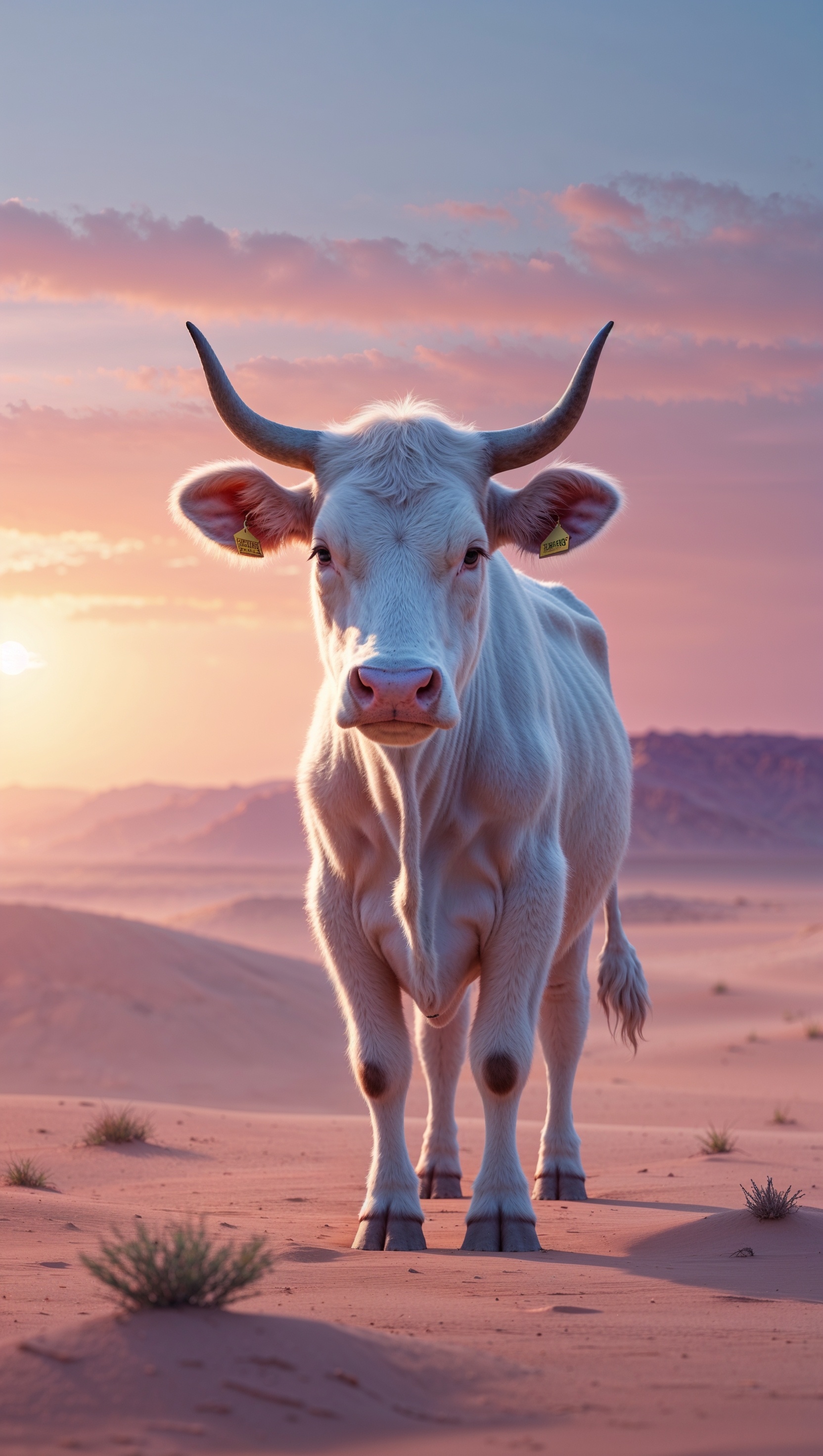 1664x2944 A cow with white hands in a desert with sunrise light for an iPhone wallpaper