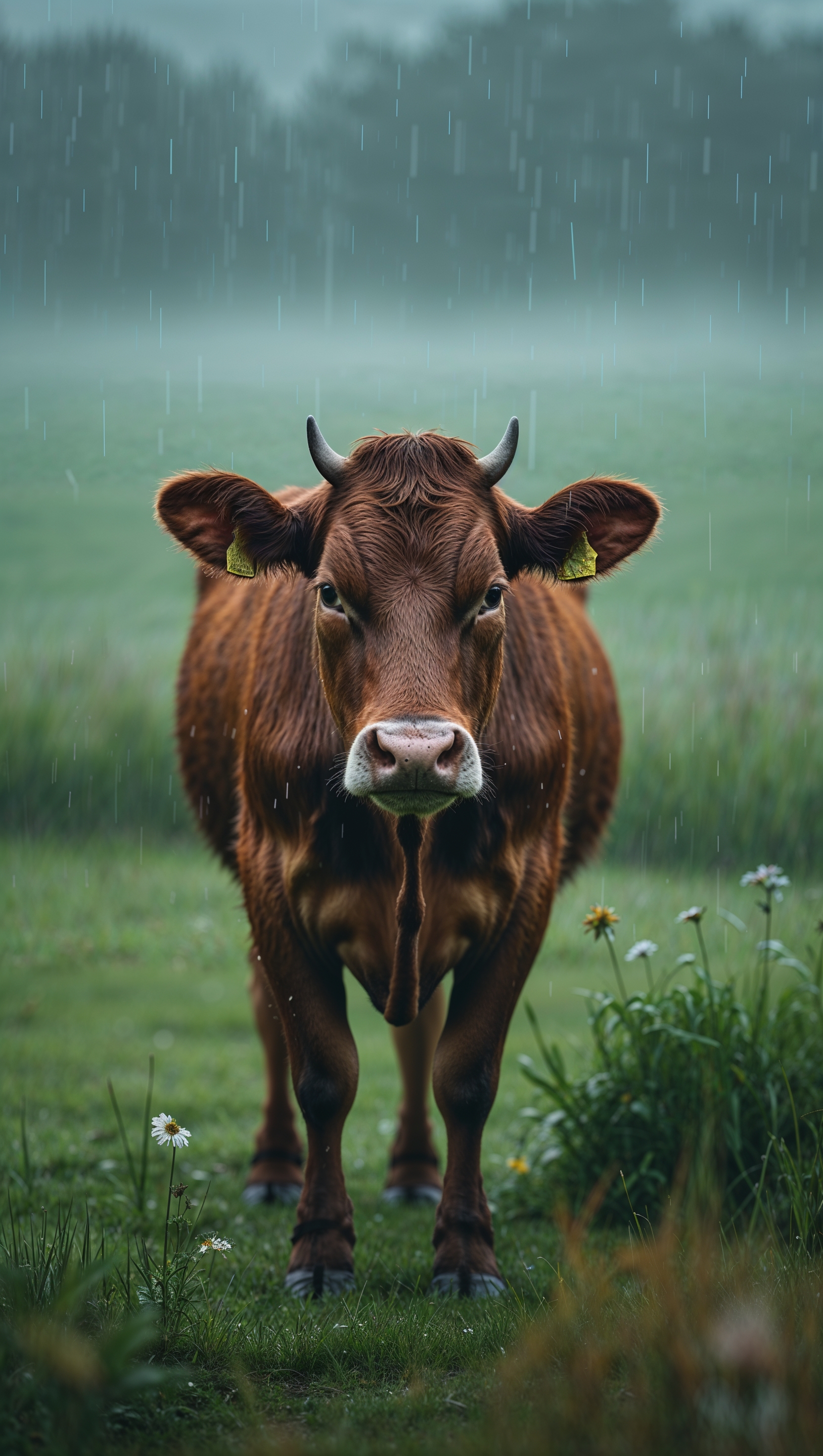 1664x2944 An image of a cow under light rain in an open field for an iPhone wallpaper