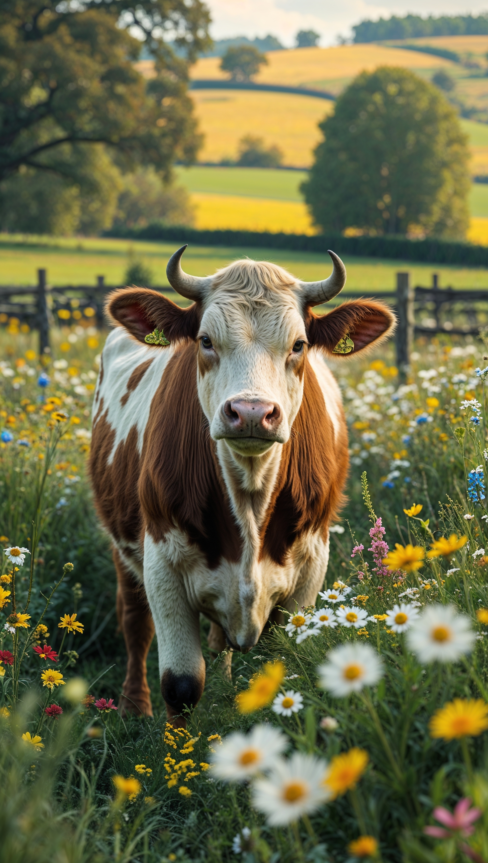 1664x2944 An image of a cow with wildflowers and agricultural fields for an iPhone wallpaper
