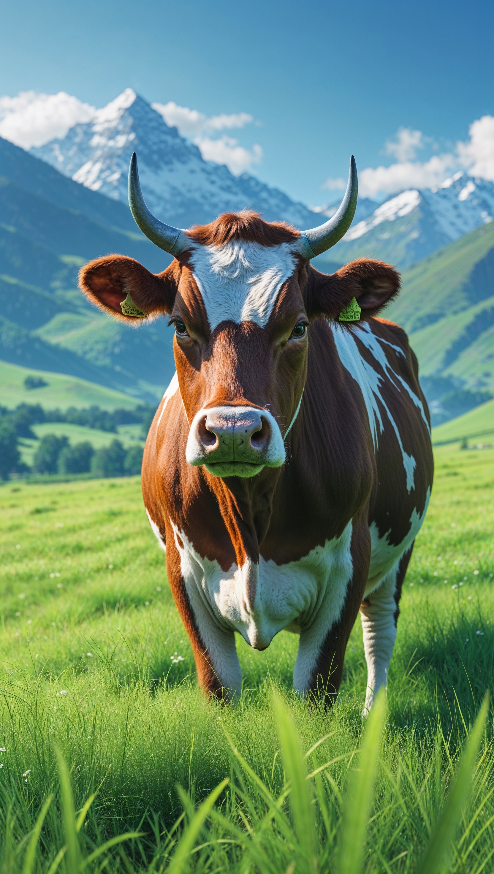 1664x2944 An image of a cow with green grass and a mountainous background for an iPhone wallpaper