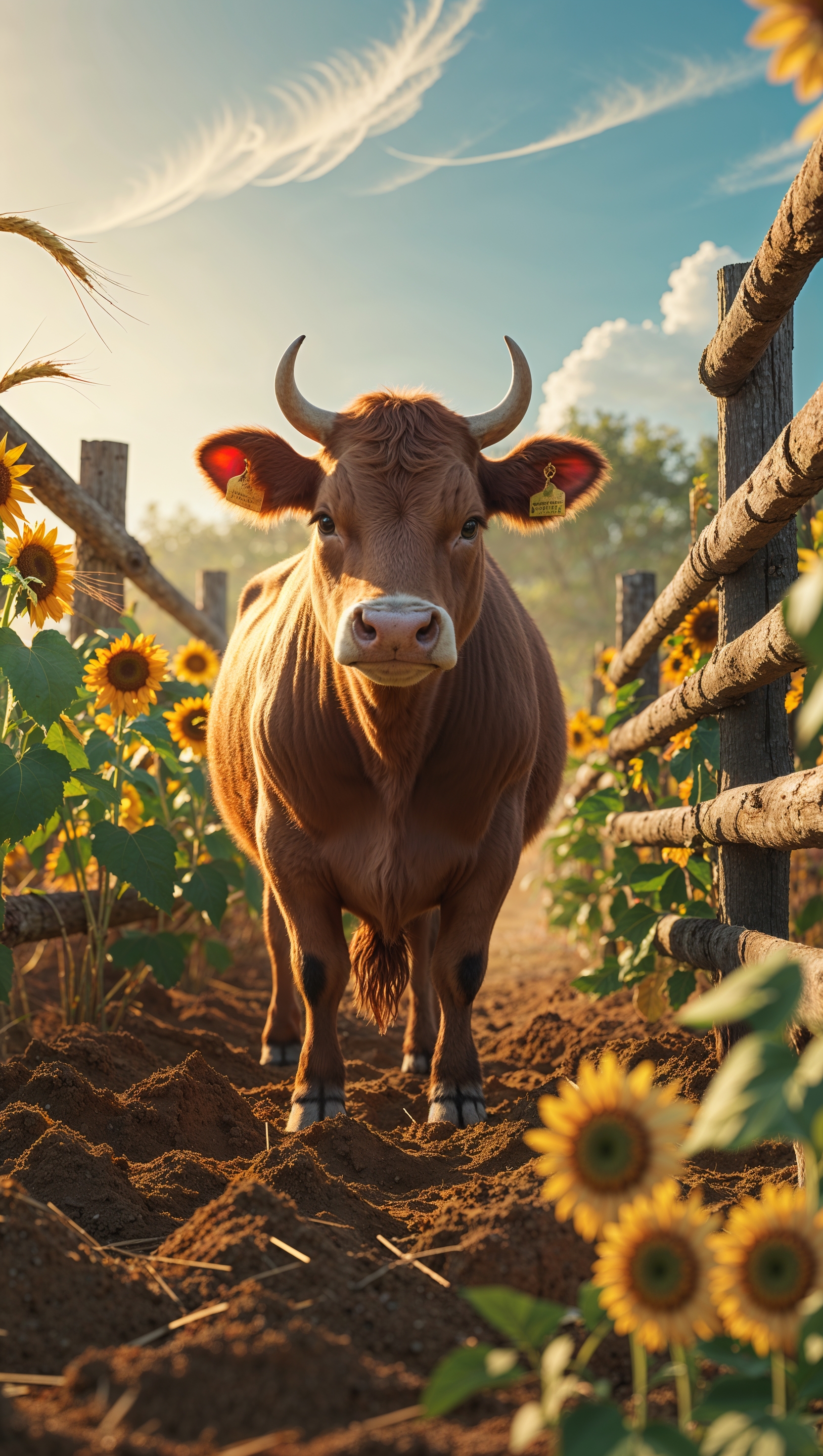 1664x2944 A beautiful cow in a farm with warm colors and golden rays in the sunlight