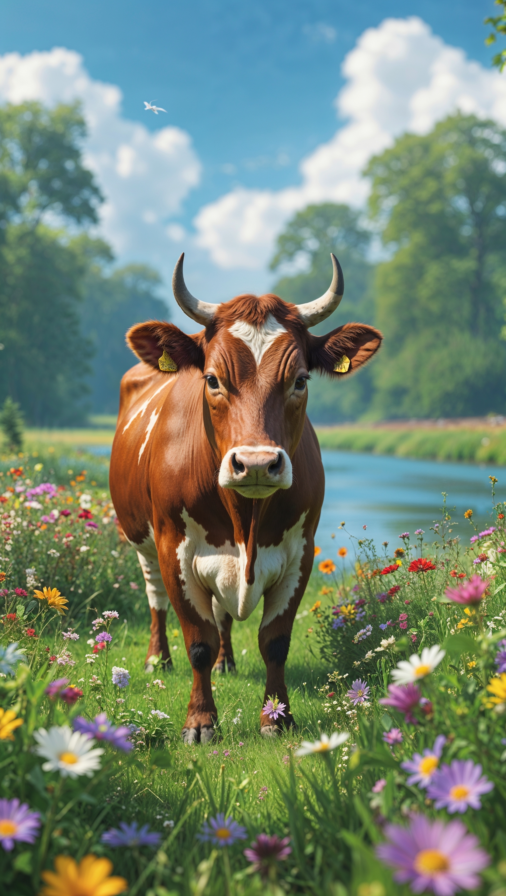 1664x2944 An image of a cow in a field of flowers with a river for an iPhone wallpaper