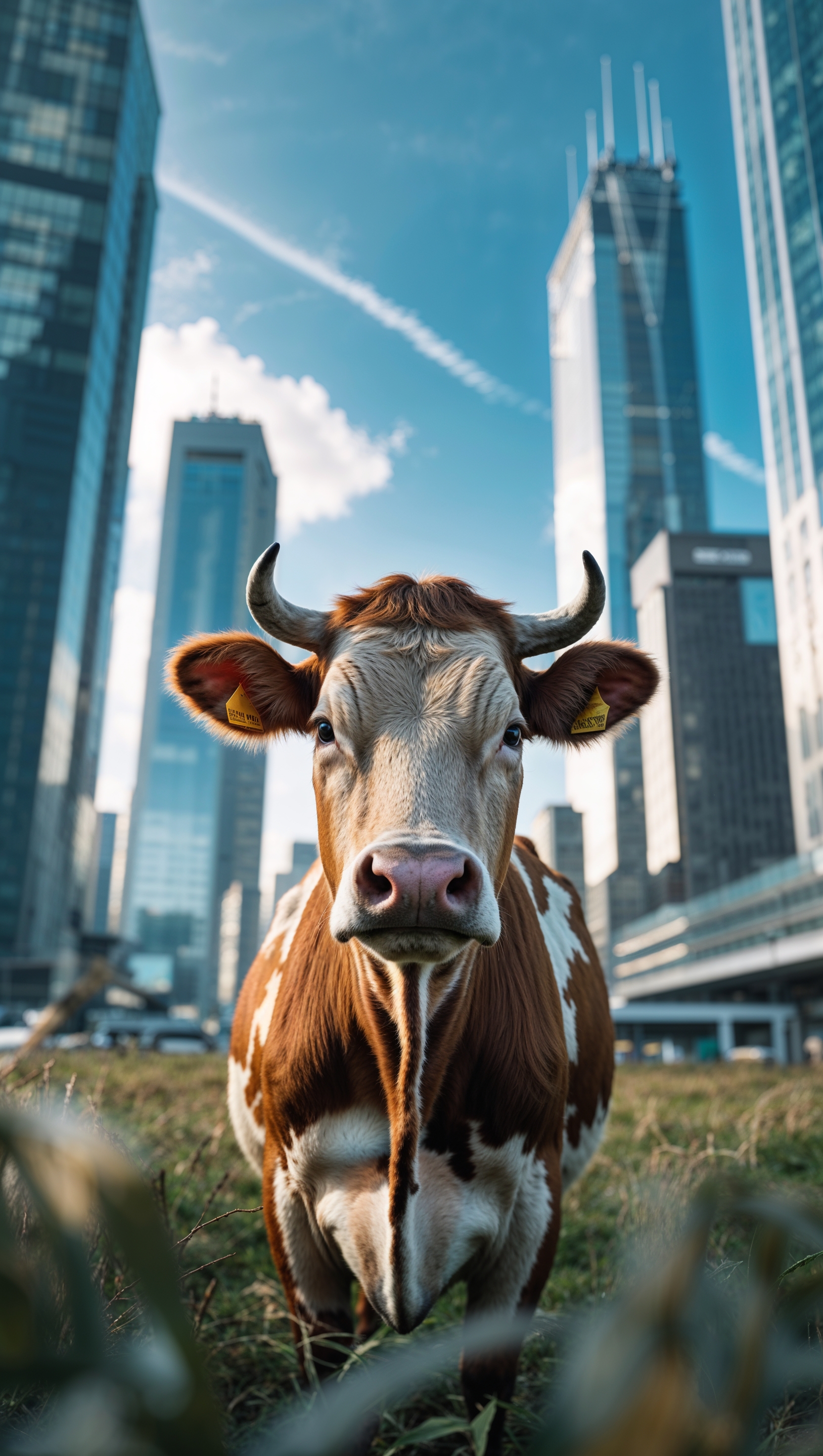 1664x2944 An image of a cow with an urban background and tall buildings for an iPhone wallpaper