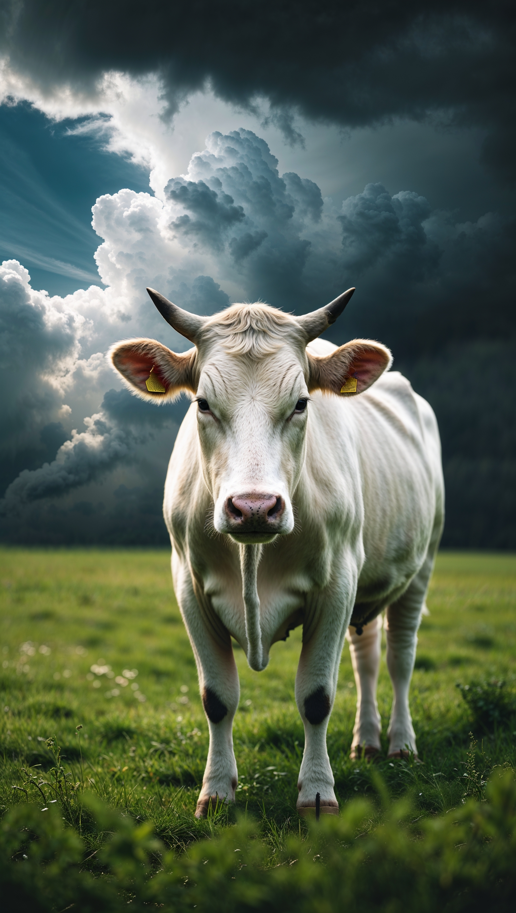 1664x2944 A white cow against a cloudy and stormy sky for an iPhone wallpaper