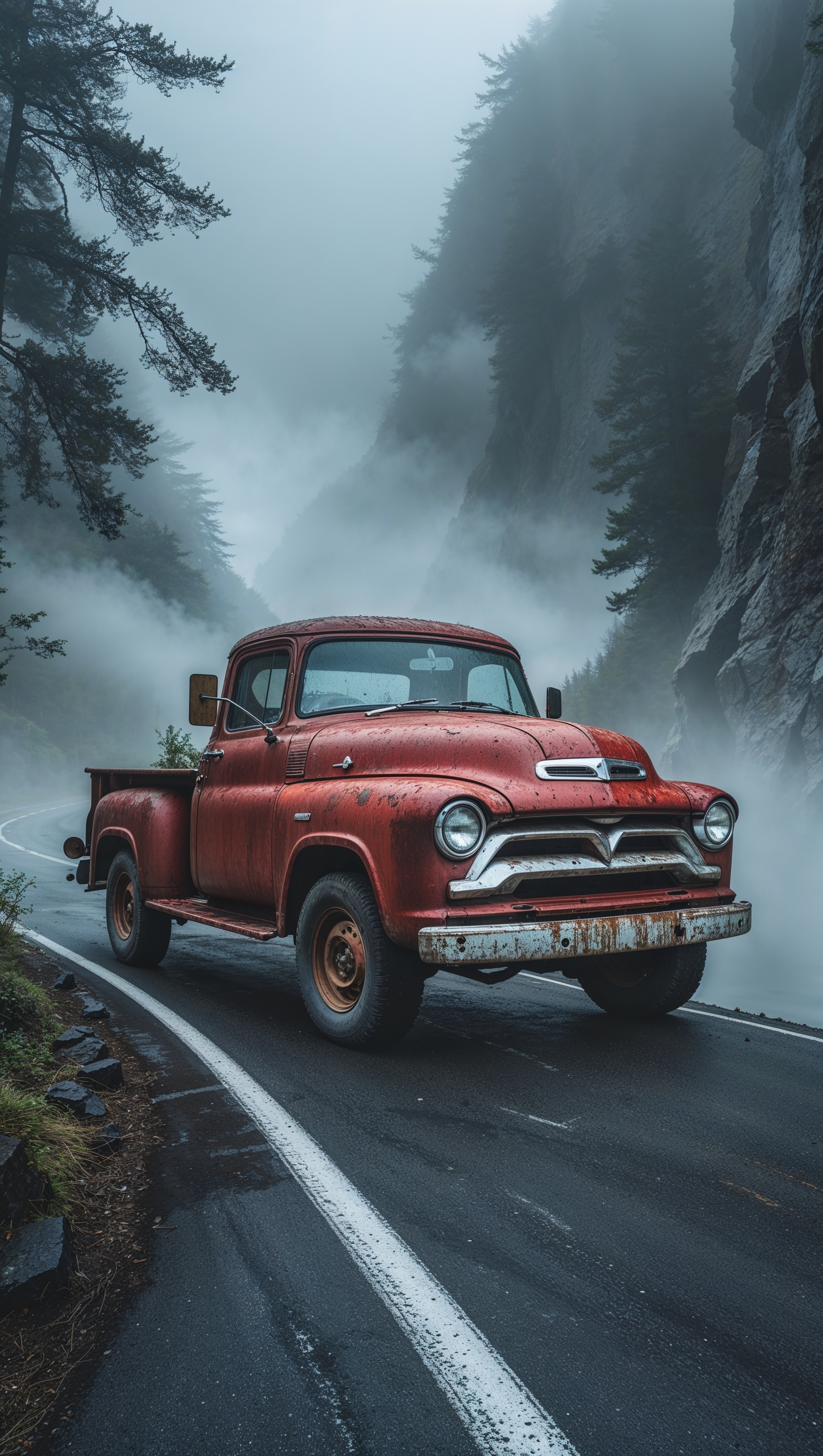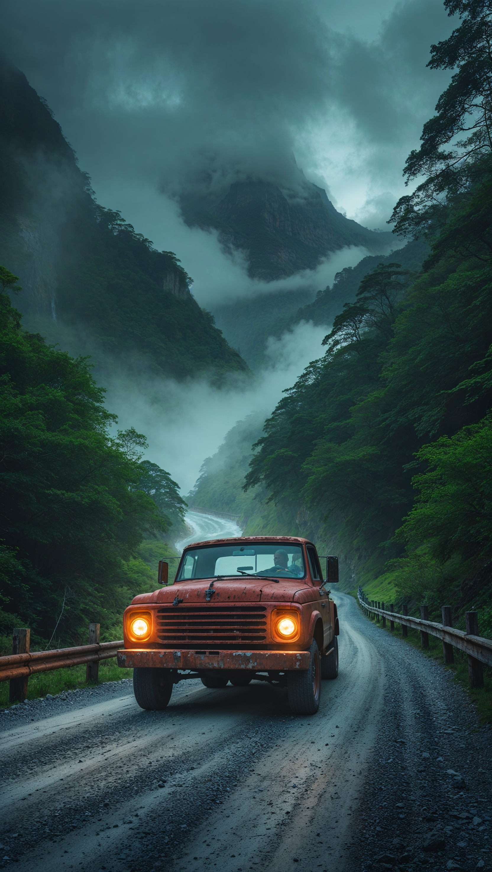 1664x2944 Truck on a winding mountain road, misty atmosphere