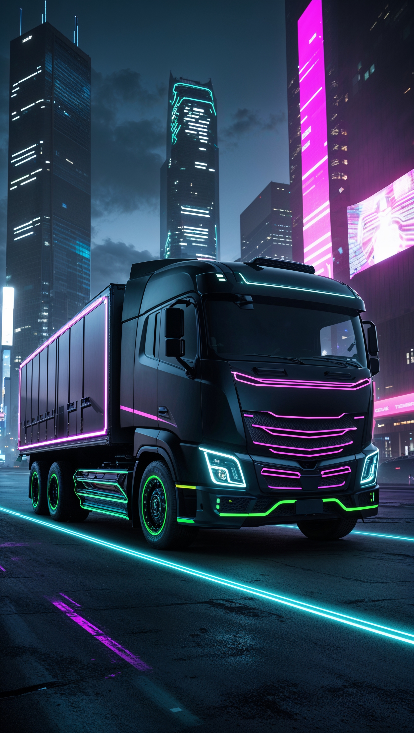 1664x2944 Black truck with neon lights at night, cyberpunk style