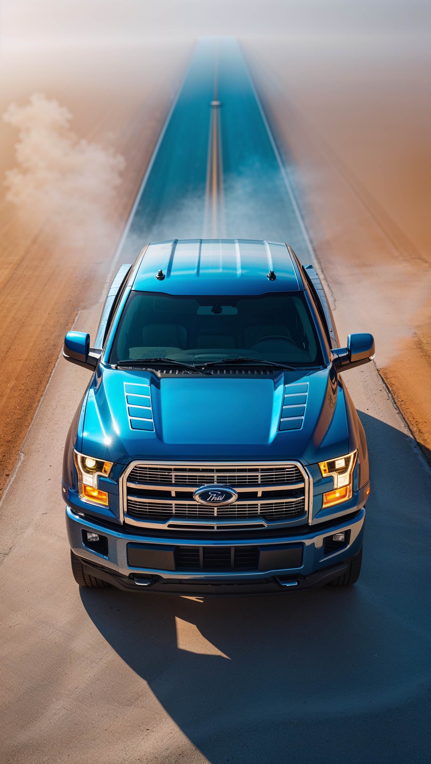 1664x2944 Metallic blue truck with sun reflections on a straight road