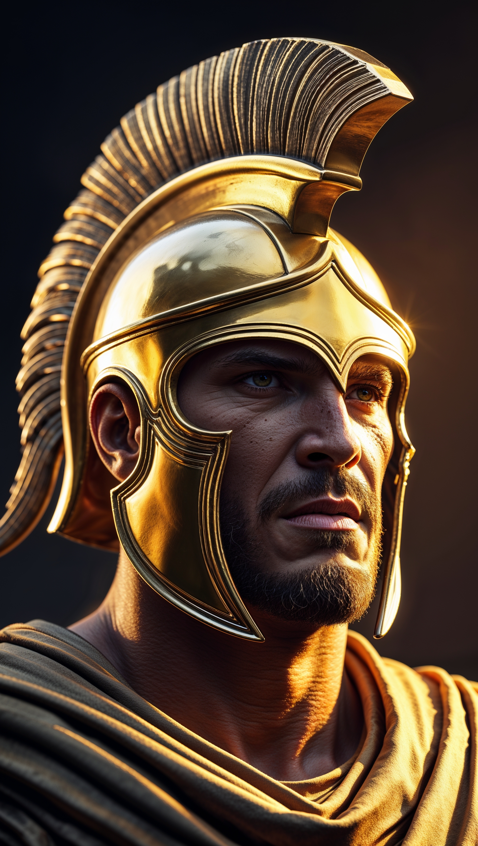 1664x2944 Close-up of a Spartan warrior with a golden helmet and dramatic lighting