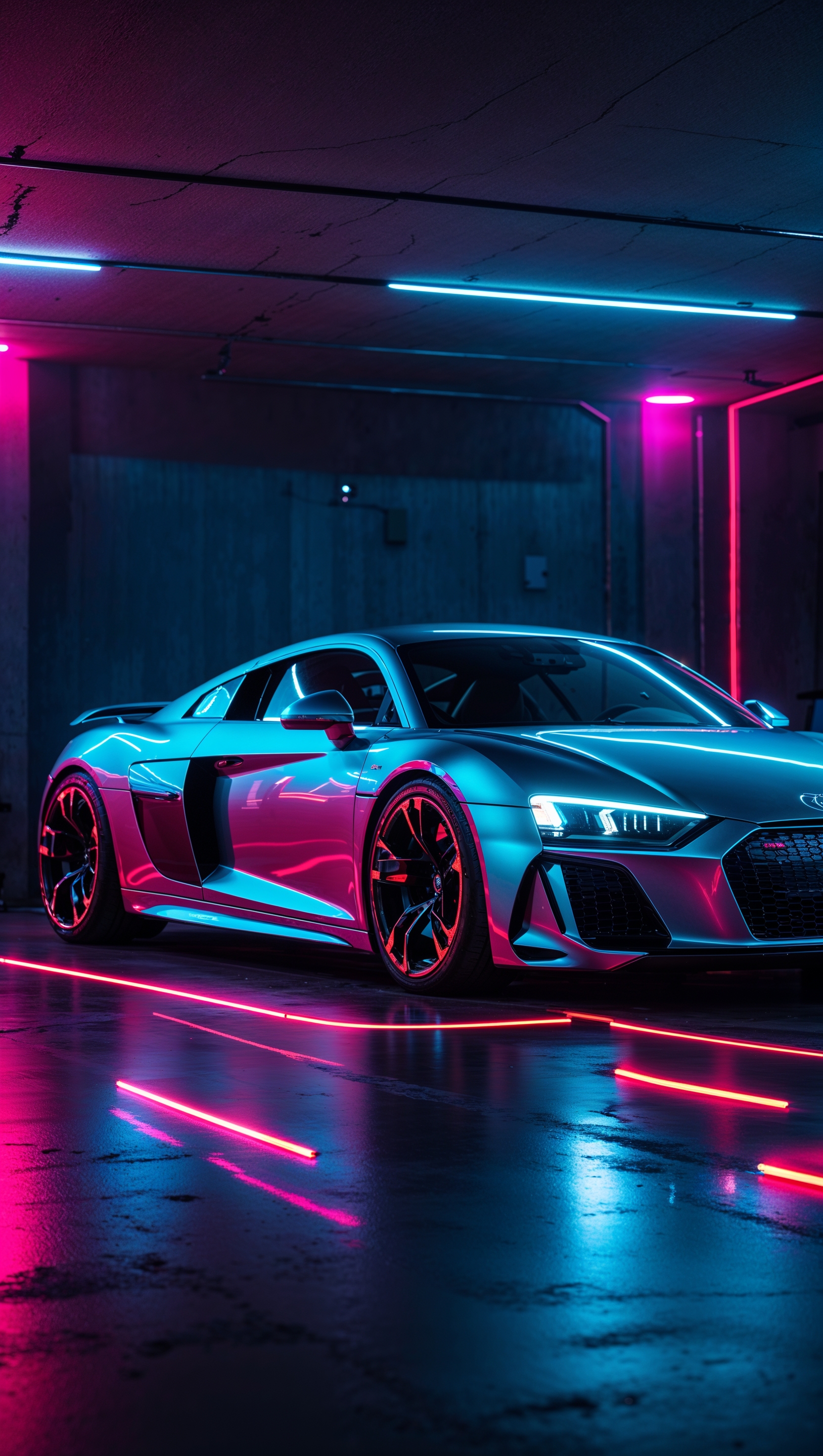 1664x2944 Audi R8 in a dark garage with colorful lights