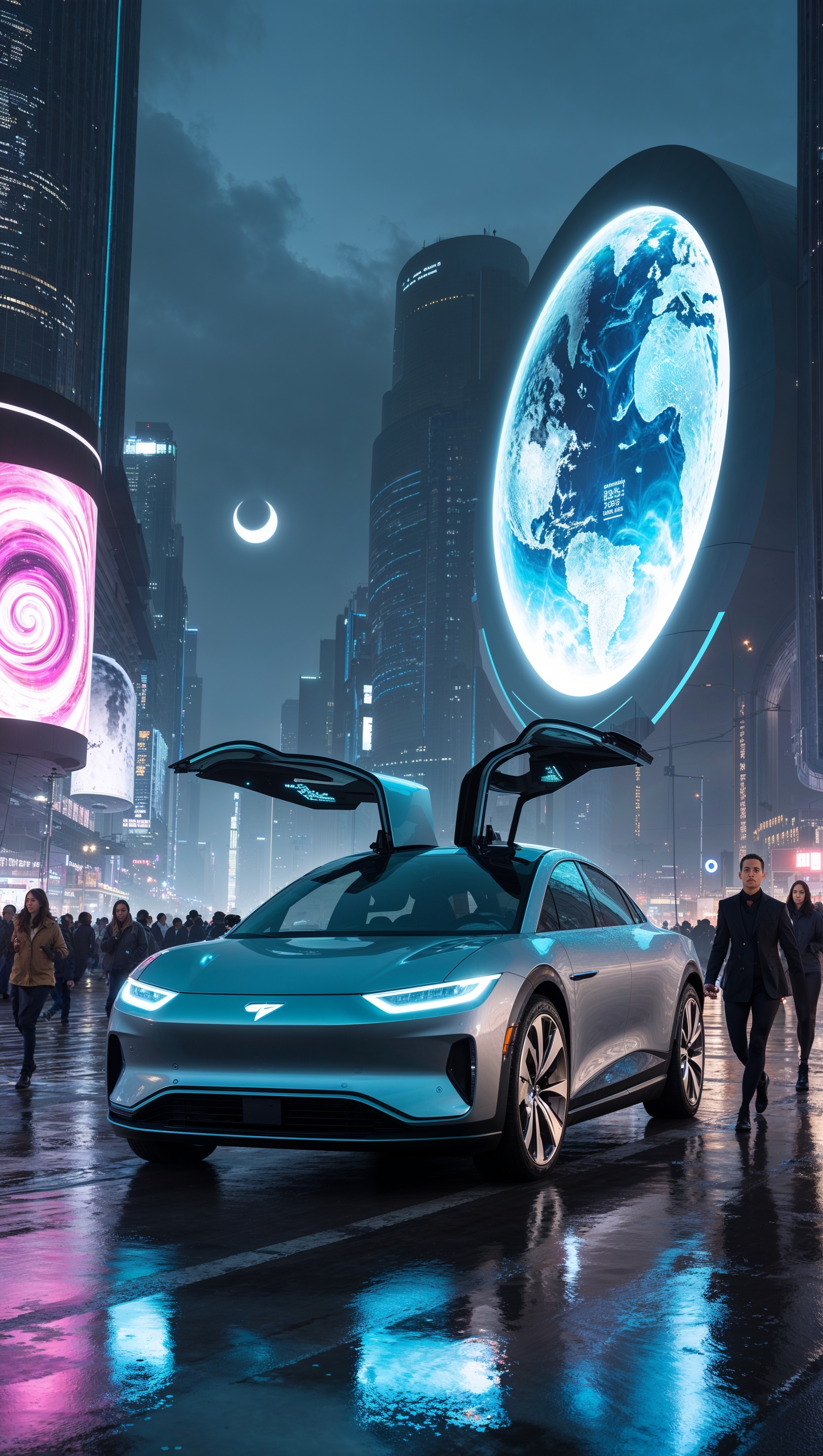 1664x2944 Electric car in a futuristic city with holographic signs