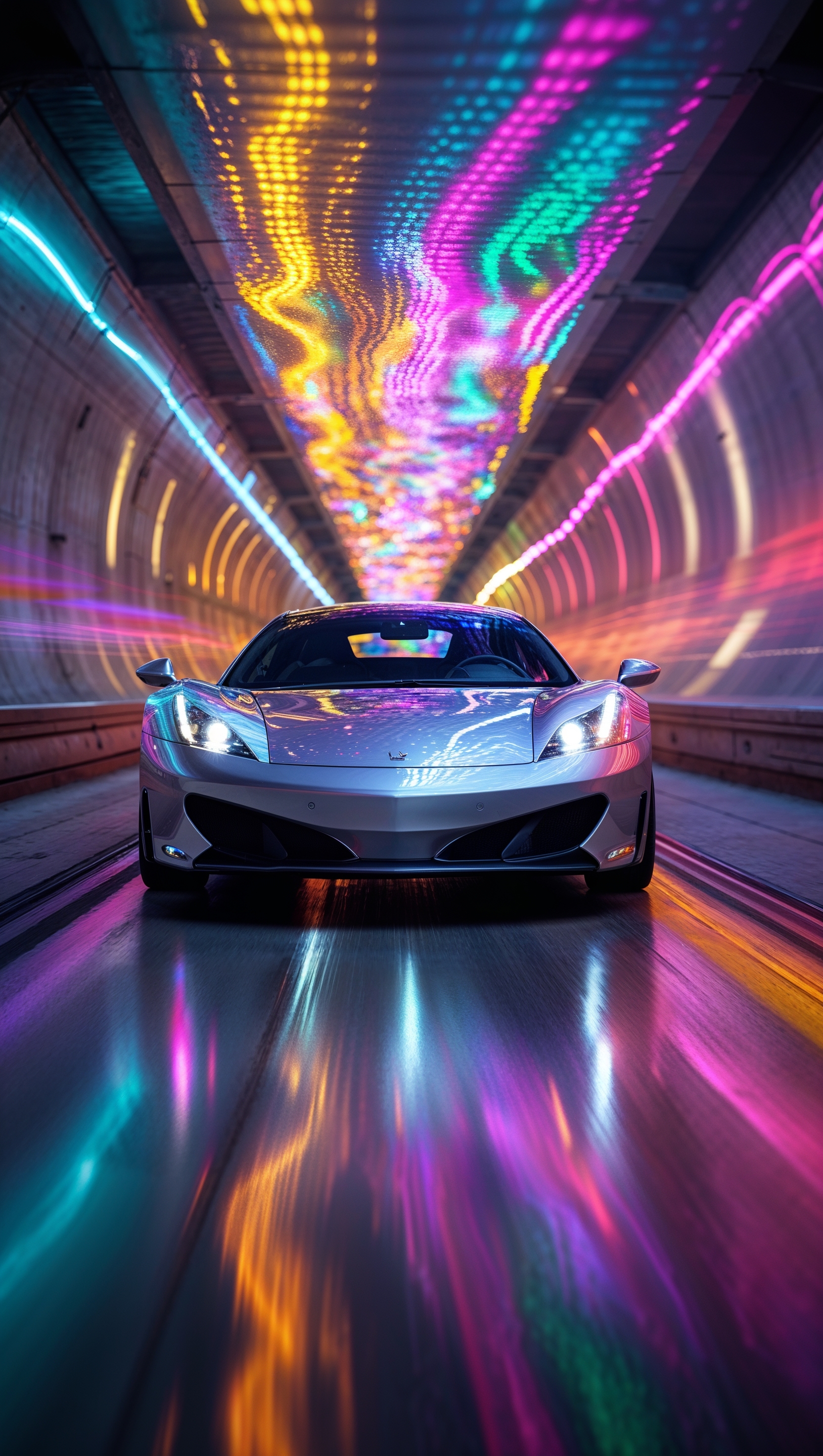 1664x2944 Car passing through a tunnel with moving colorful lights