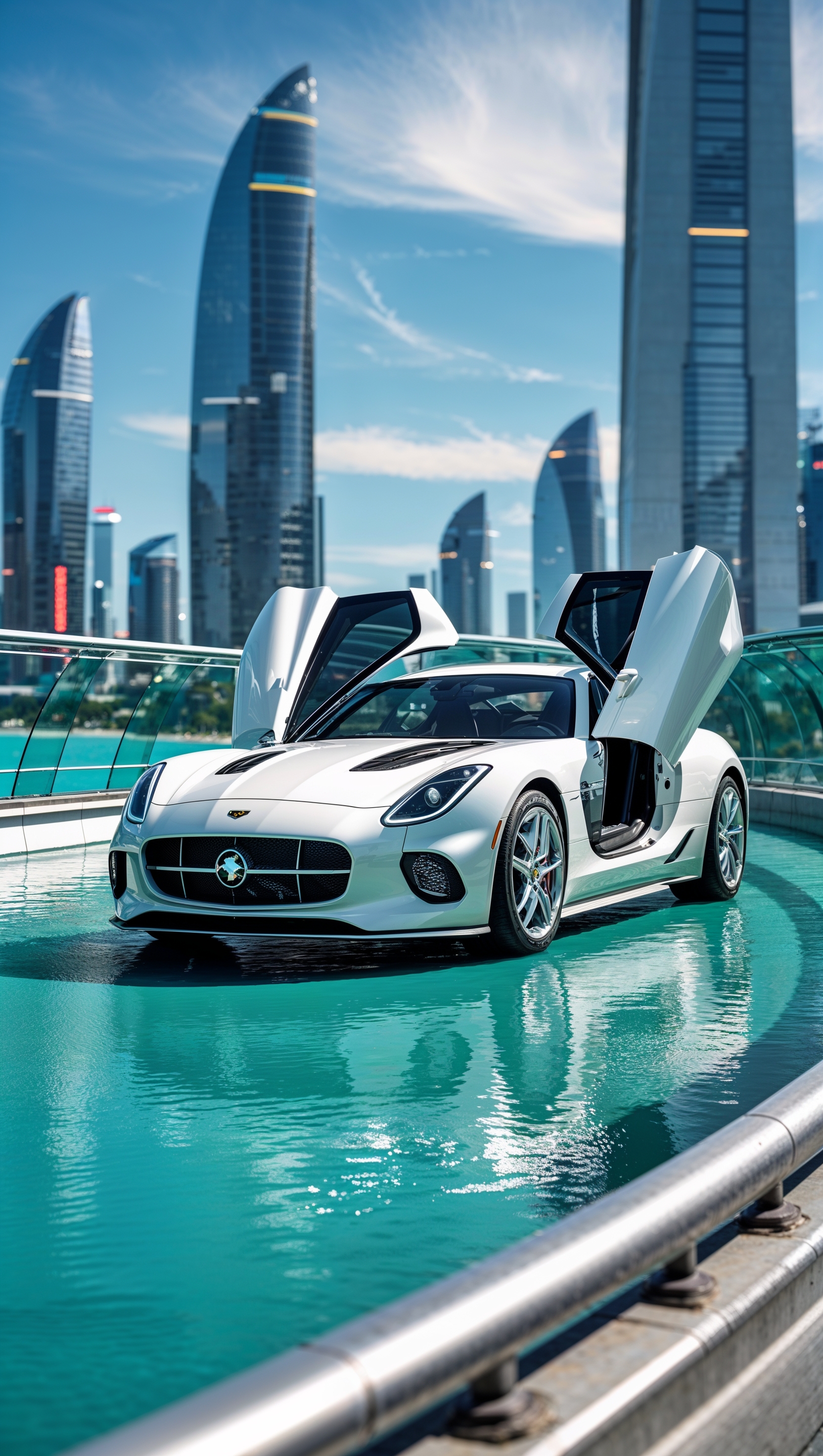 1664x2944 White sports car on a modern glass bridge