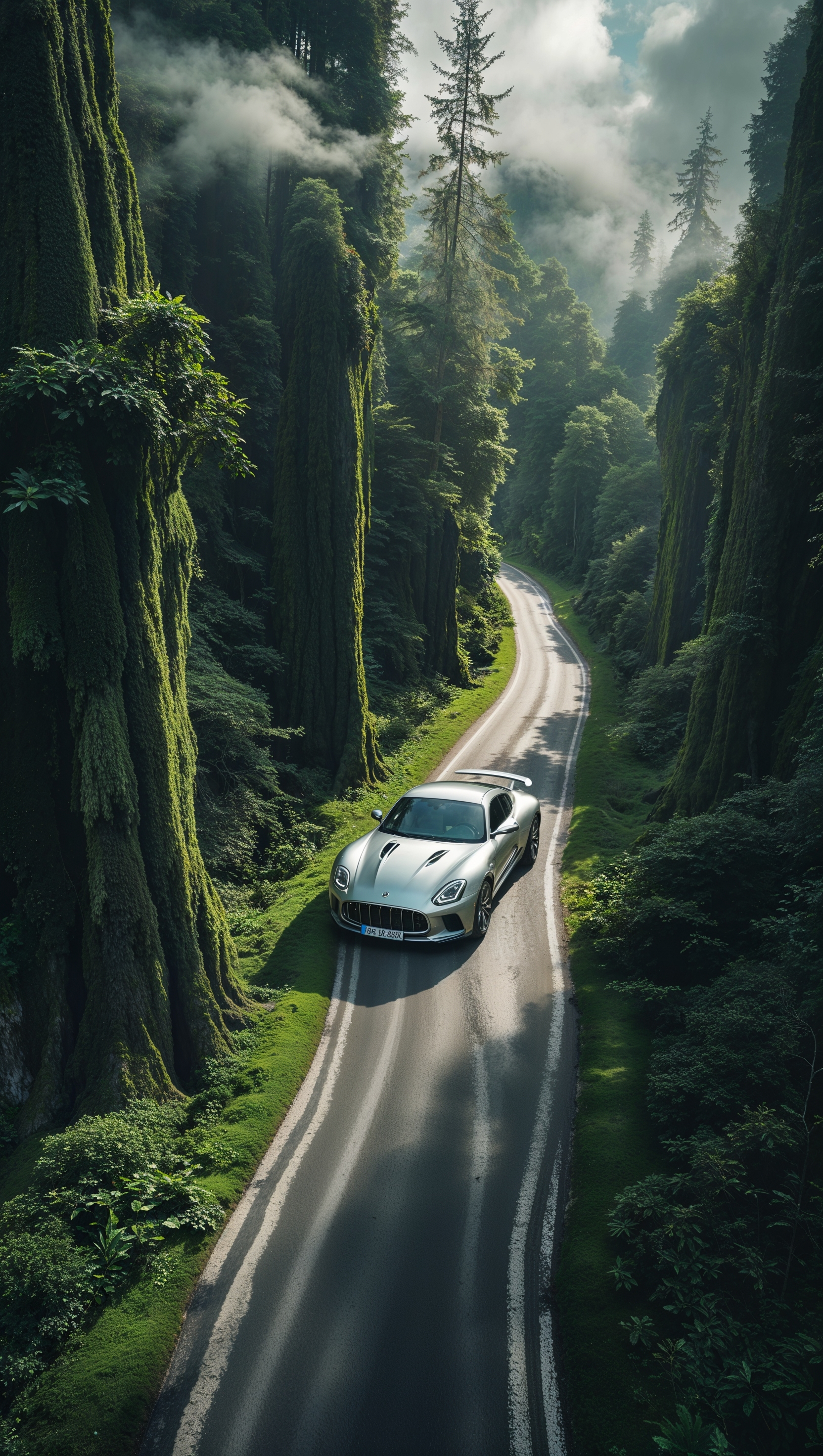 1664x2944 Aerial view of a car on a winding forest road