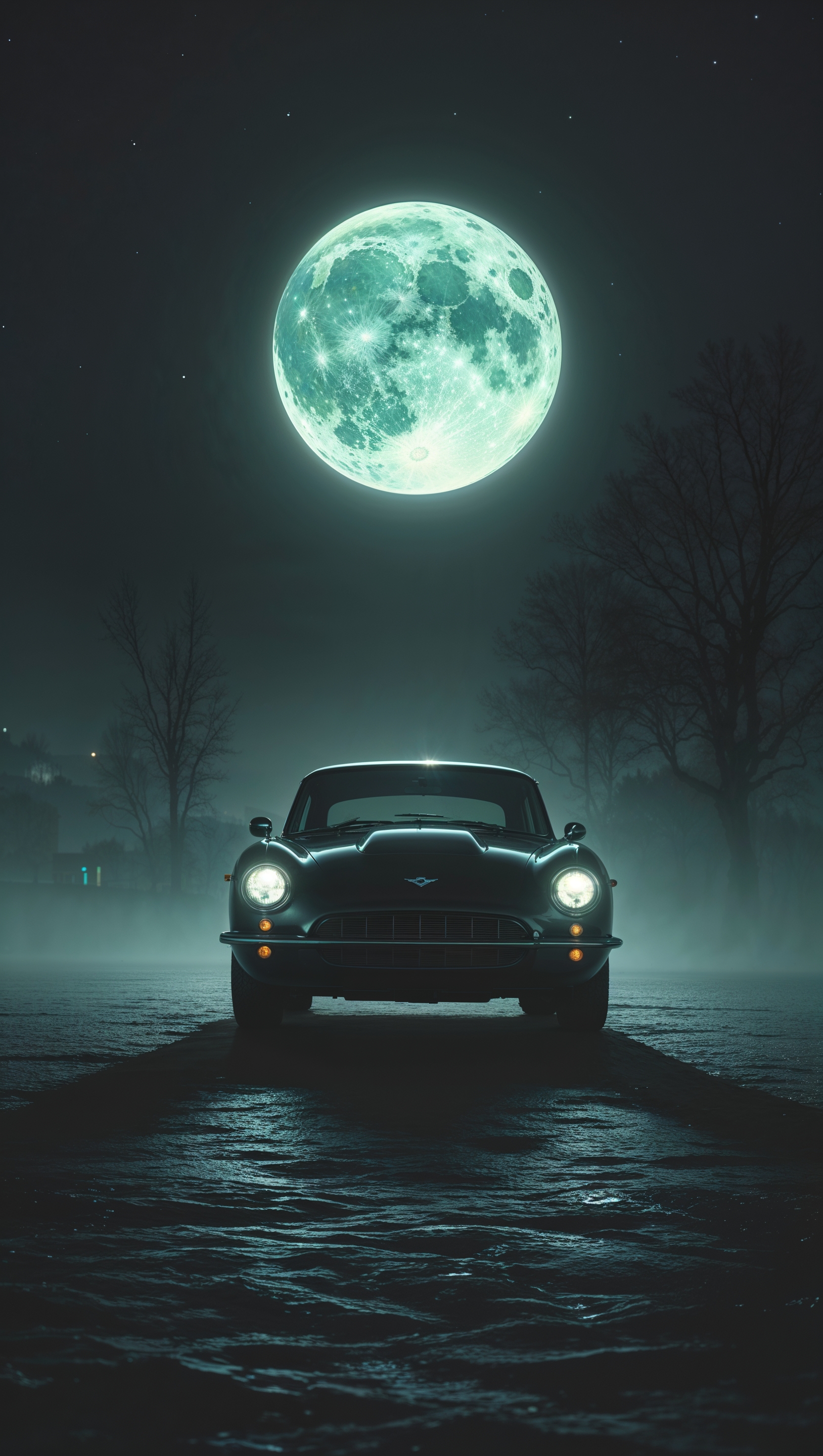 1664x2944 Dark wallpaper with a lone car under moonlight