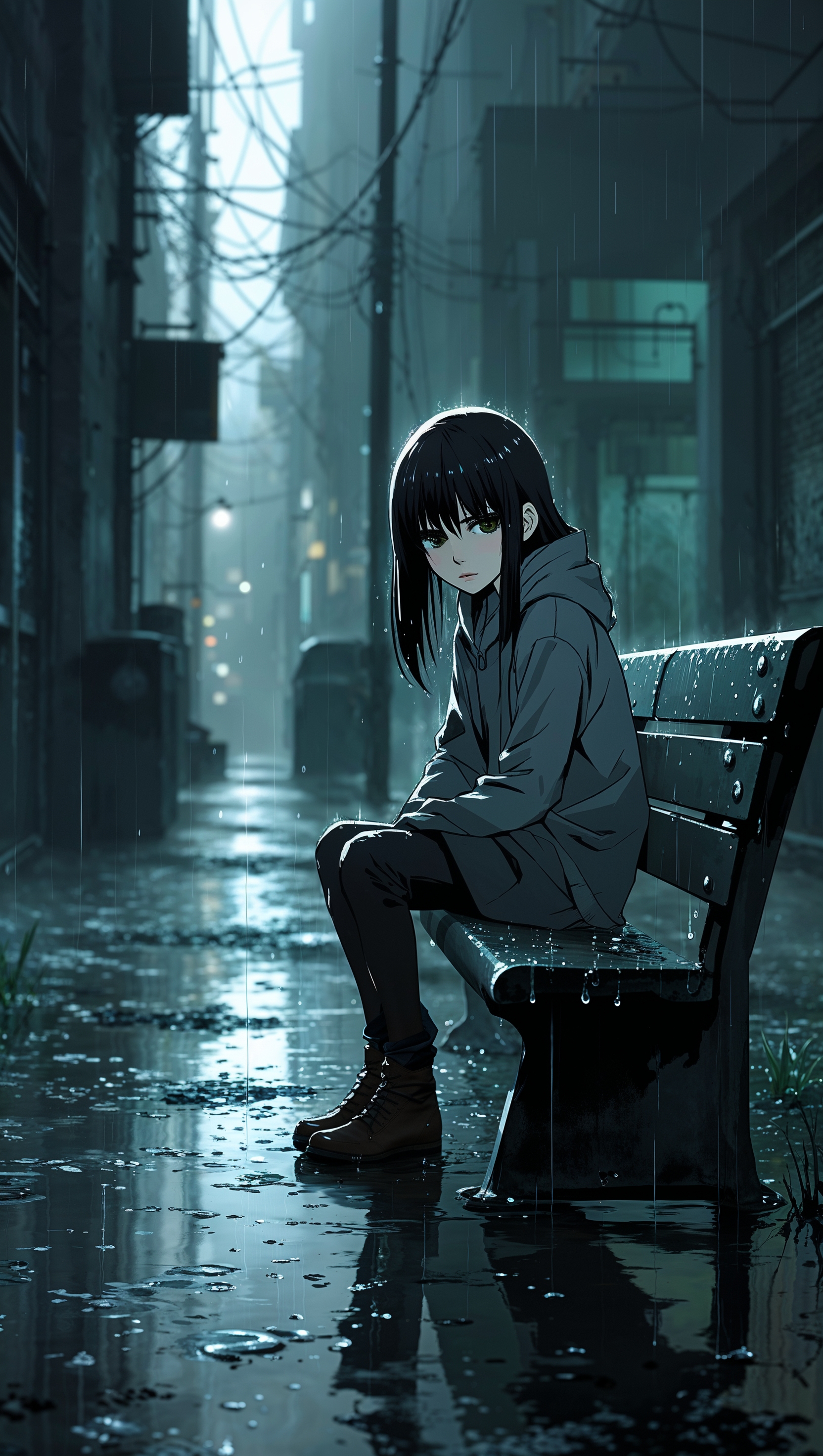 1664x2944 A sad anime character sitting alone in the rain, moody tones, iPhone wallpaper