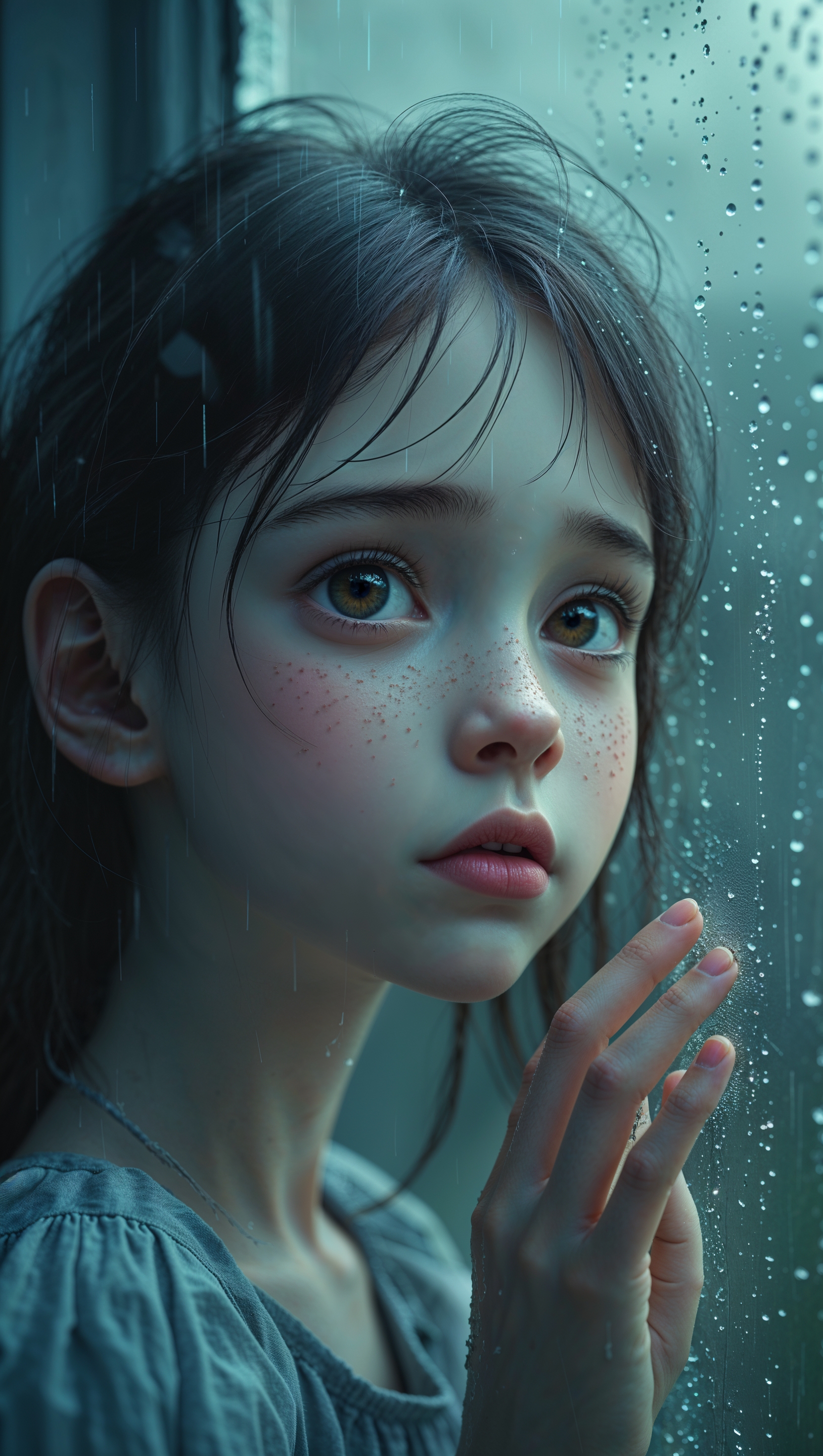 1664x2944 A sad girl looking out of a rainy window, cinematic mood, iPhone wallpaper