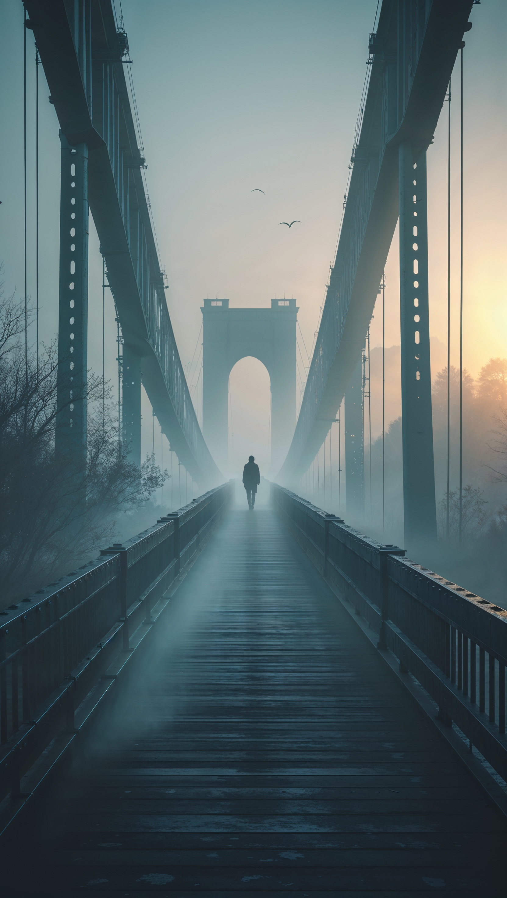 1664x2944 A foggy bridge at dawn, symbolic of loneliness and despair, iPhone wallpaper