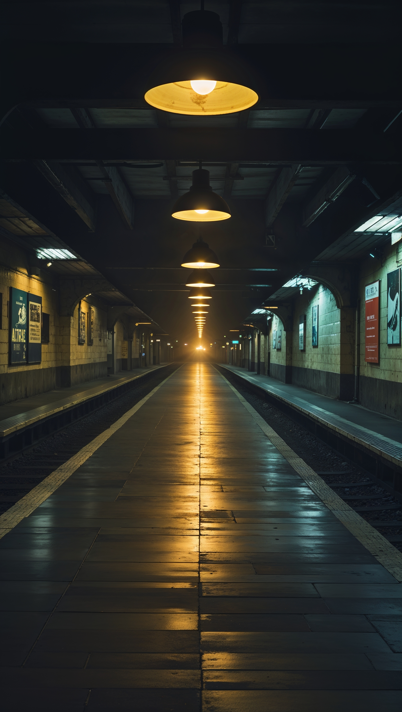 1664x2944 An empty train station at midnight, moody tones, iPhone wallpaper