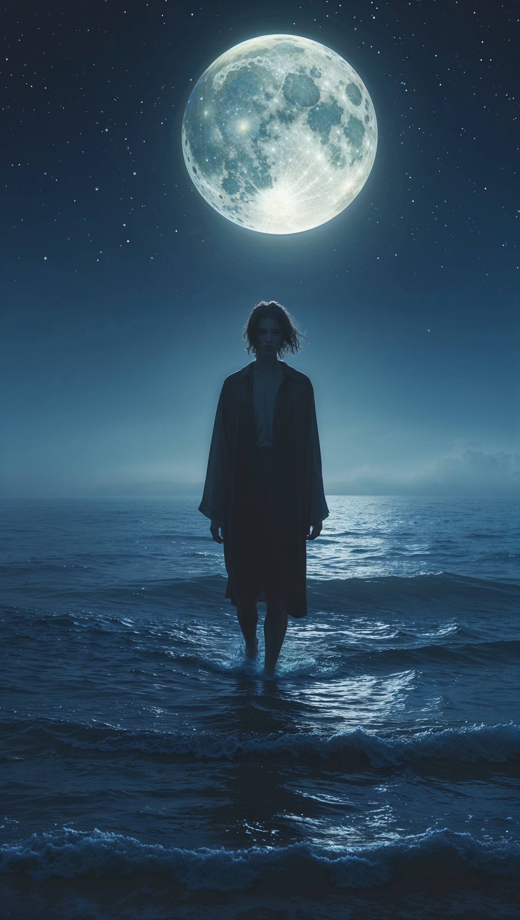 1664x2944 A lone figure walking into the ocean under a full moon, surreal and melancholic, iPhone wallpaper