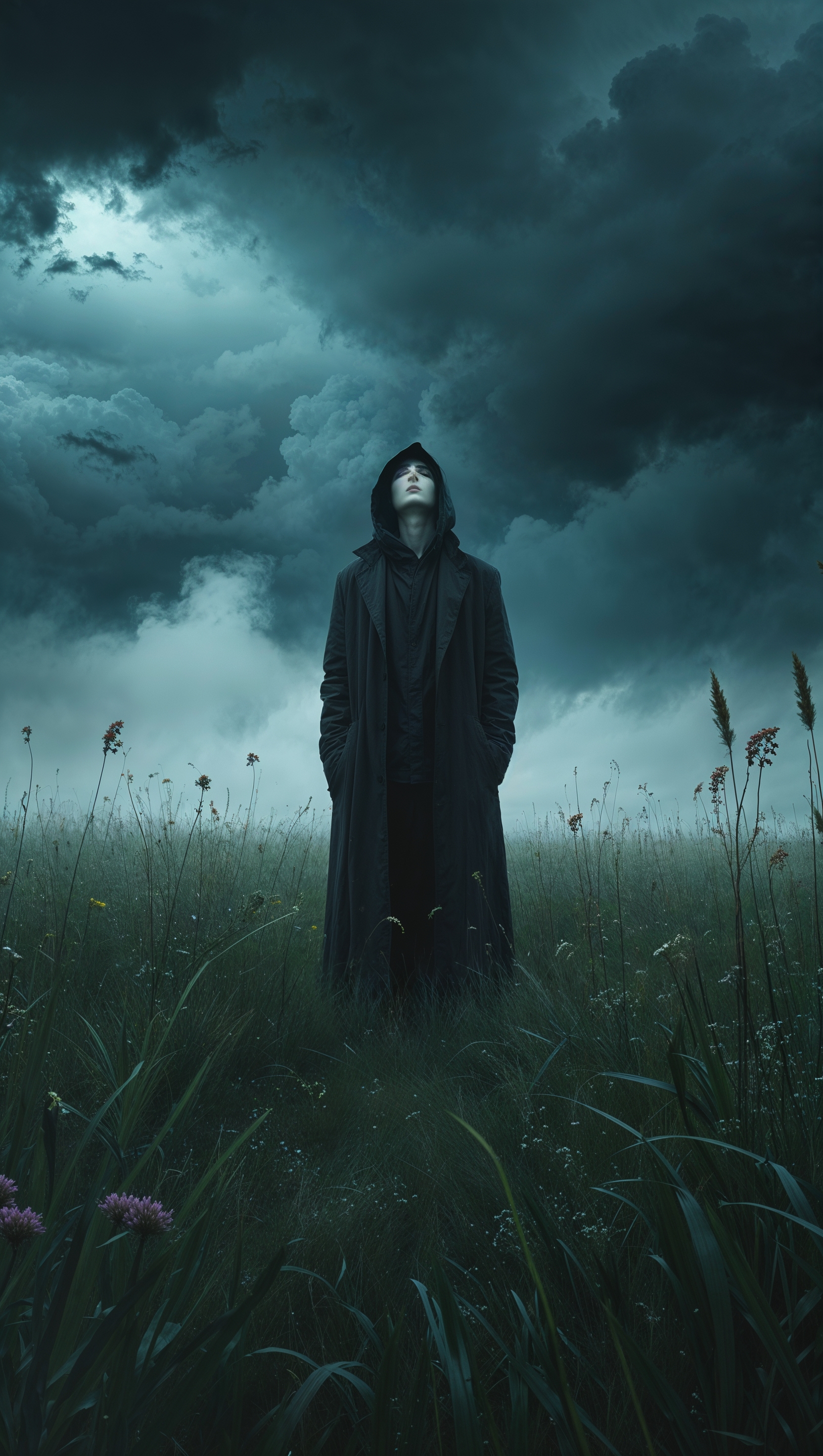 1664x2944 A person standing alone in a field under a stormy sky, iPhone wallpaper