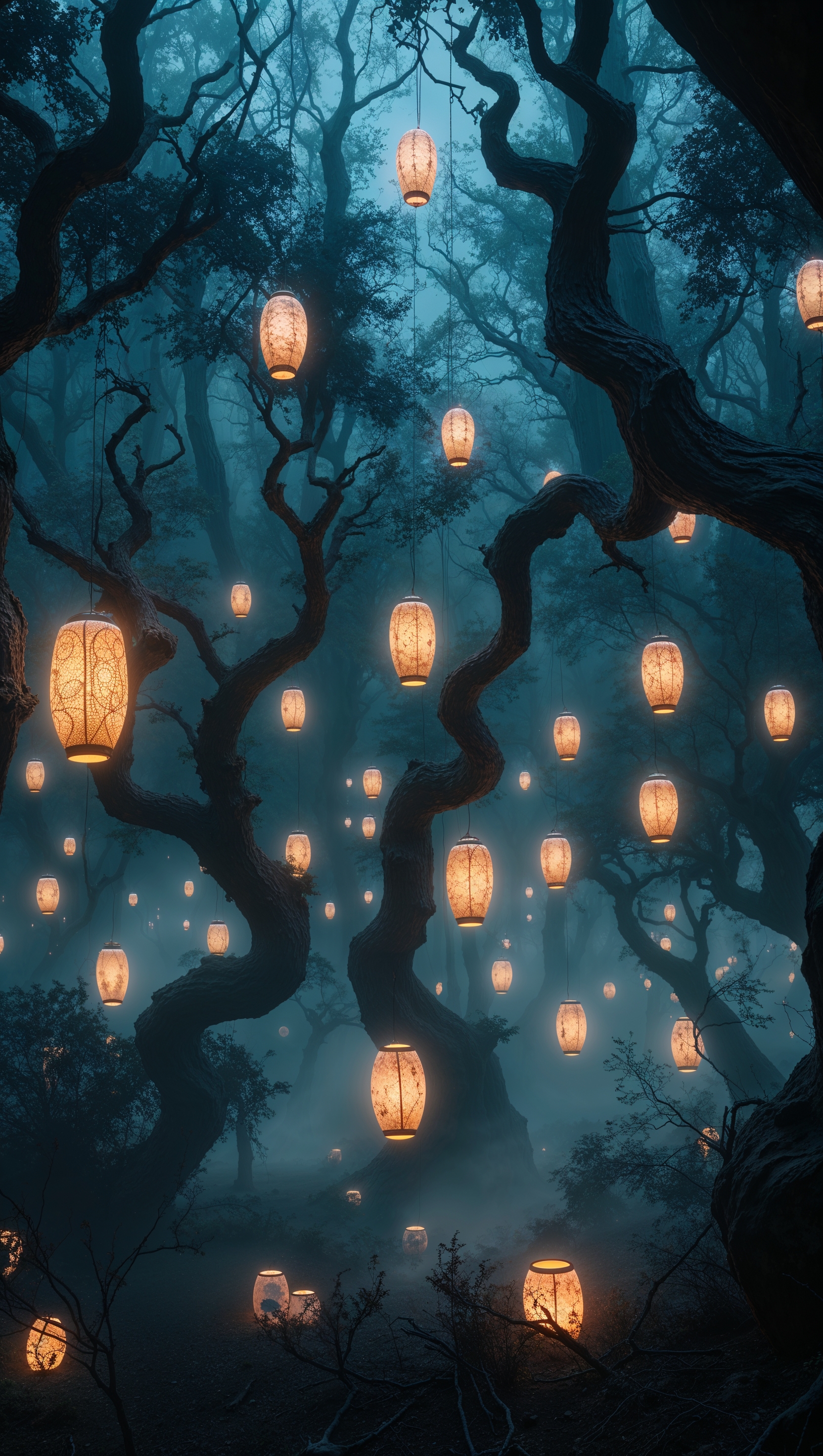 1664x2944 Dark surreal forest with floating lanterns, melancholy and mystery, iPhone wallpaper