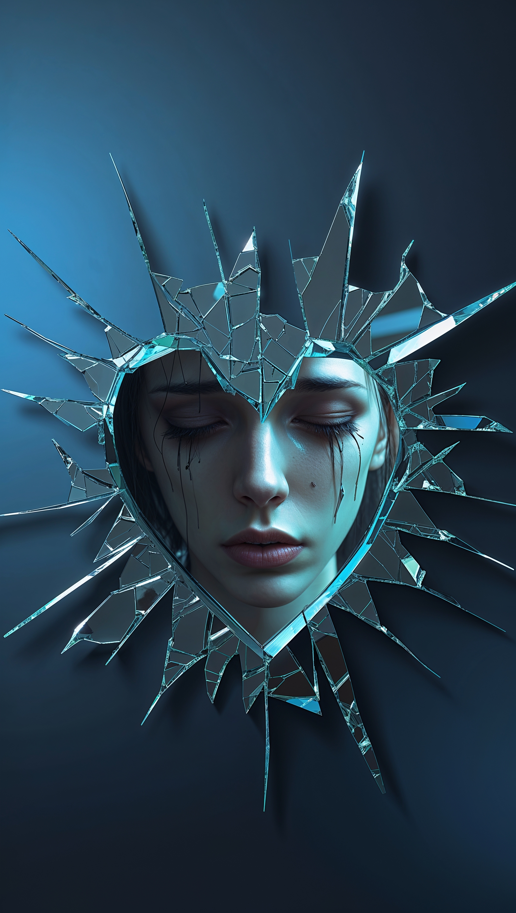 1664x2944 A digital art of a shattered mirror with a sad face reflection, iPhone wallpaper
