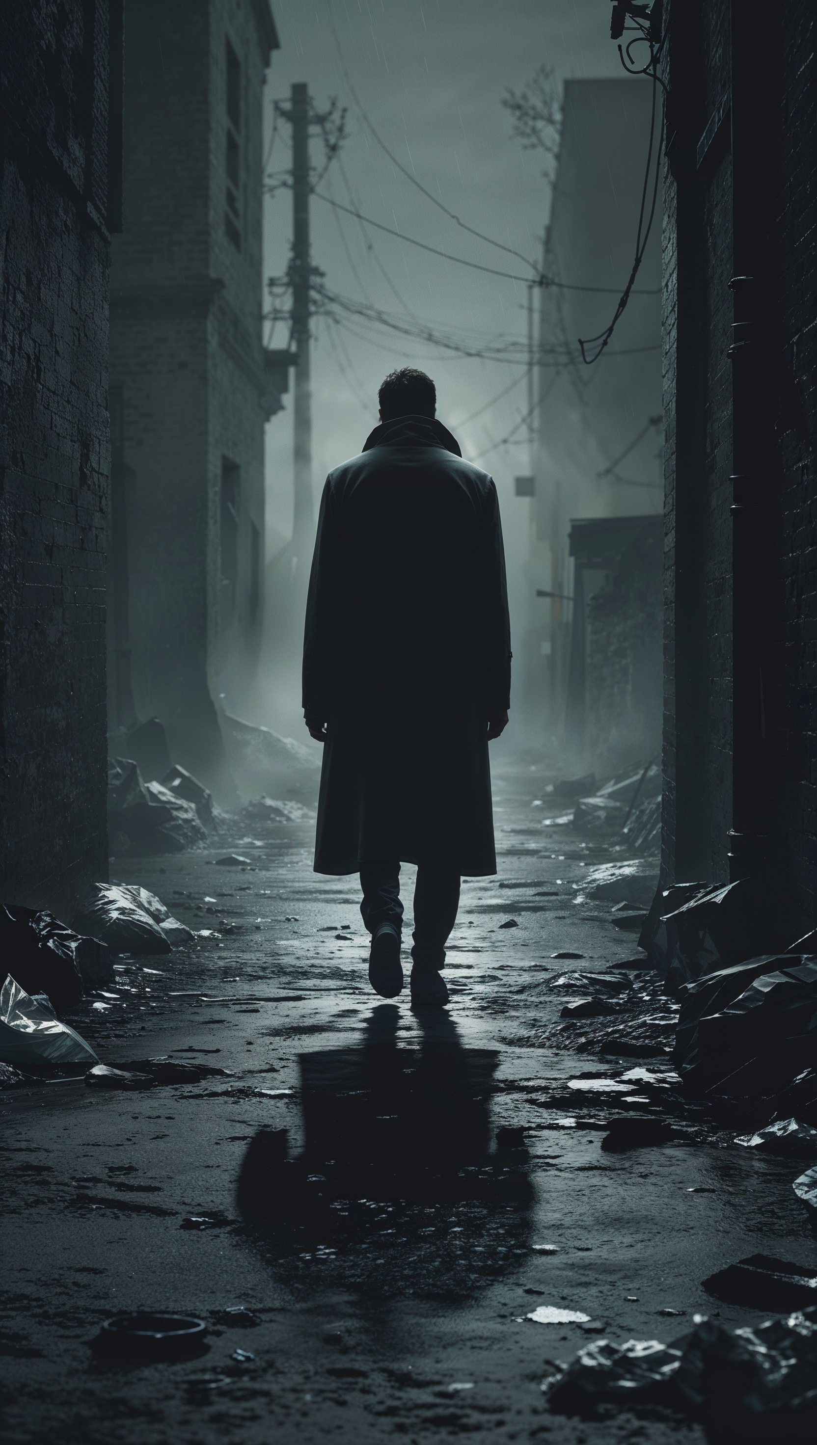 1664x2944 A fading shadow walking away in an alley, symbolic of isolation, iPhone wallpaper