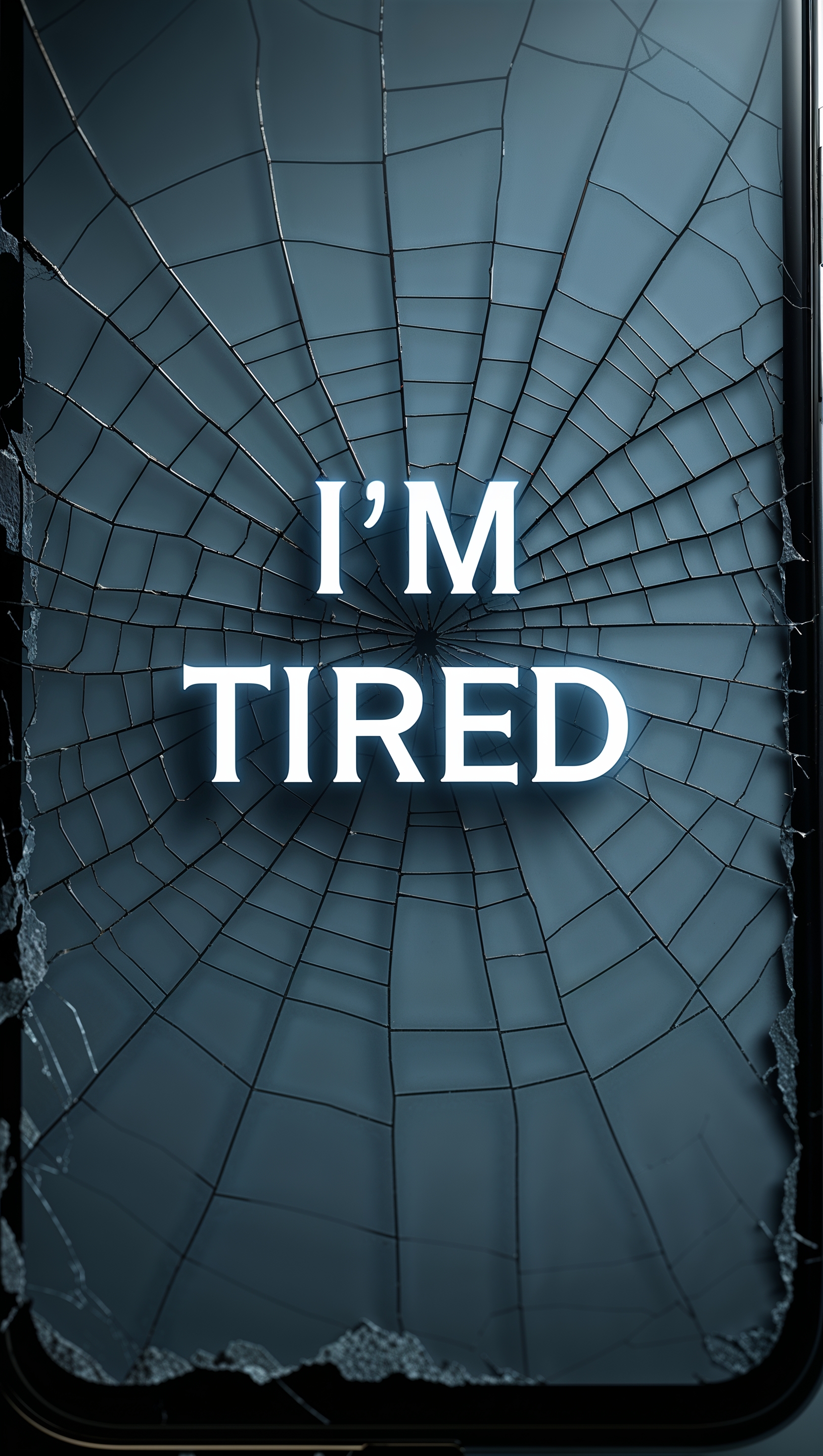1664x2944 A cracked phone screen showing a message: 'I’m tired', iPhone wallpaper