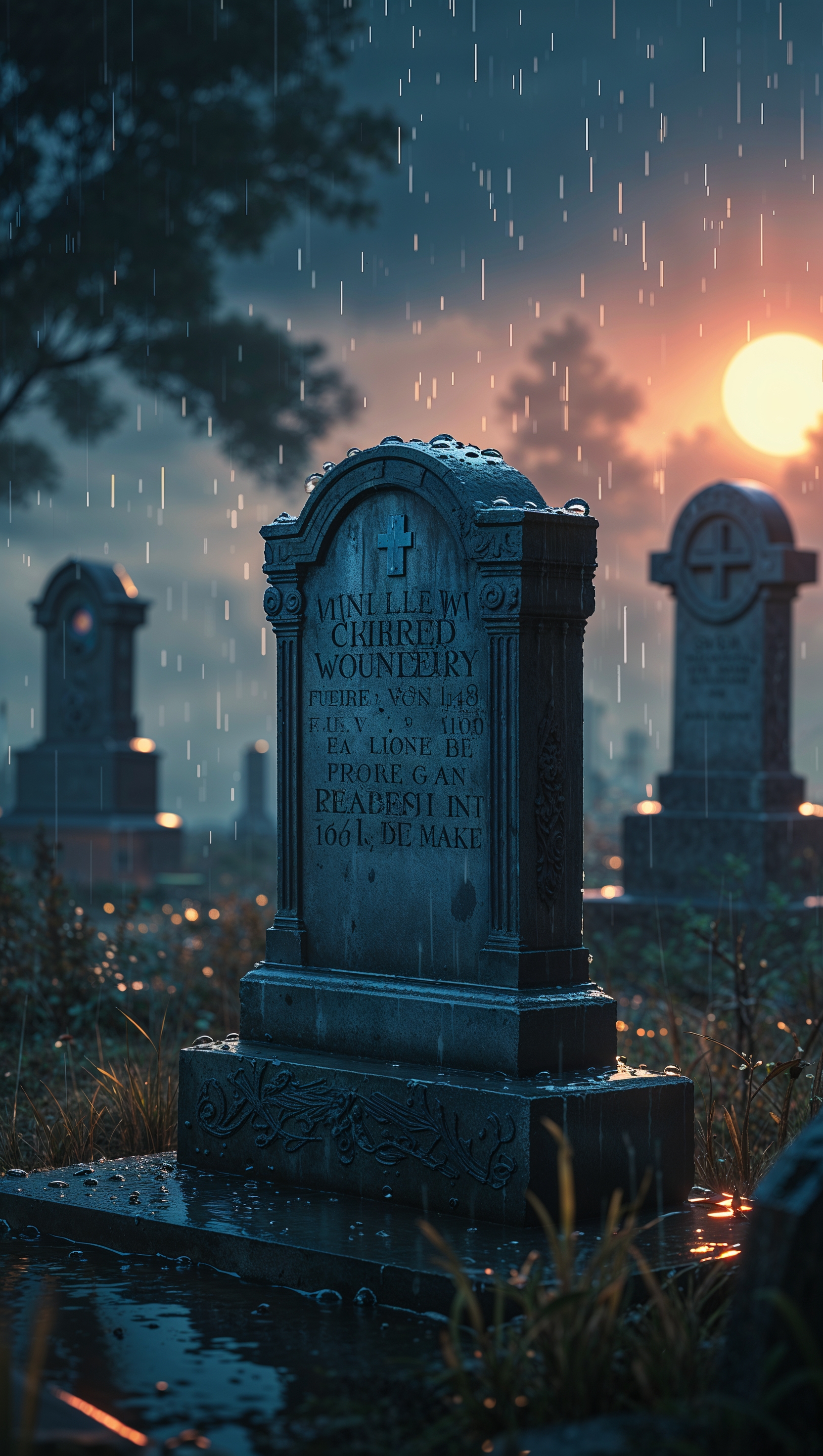 1664x2944 Rain falling over a lonely grave at dusk, realistic art, iPhone wallpaper