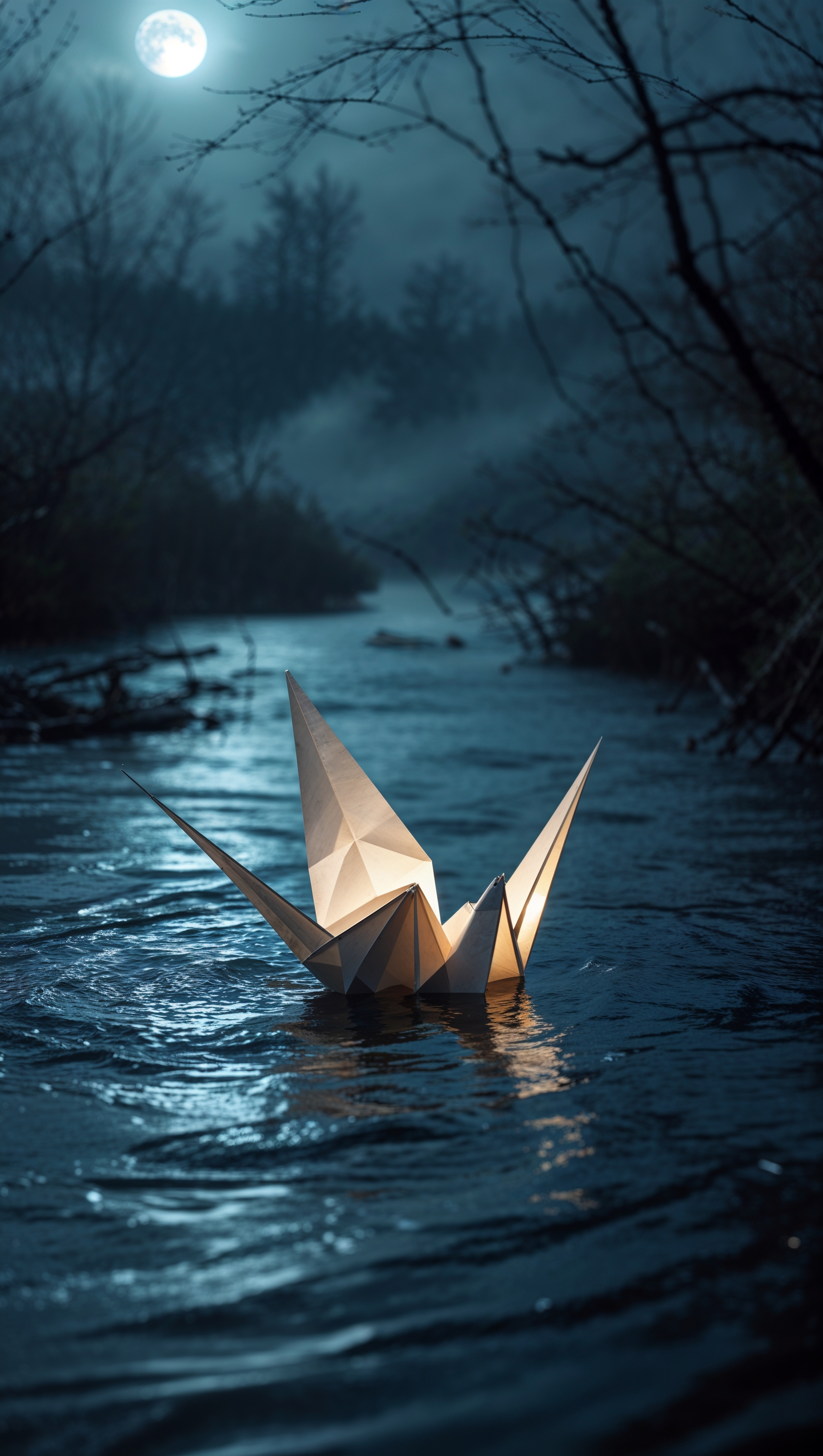 1664x2944 A paper crane floating in a dark river, concept of lost hope, iPhone wallpaper