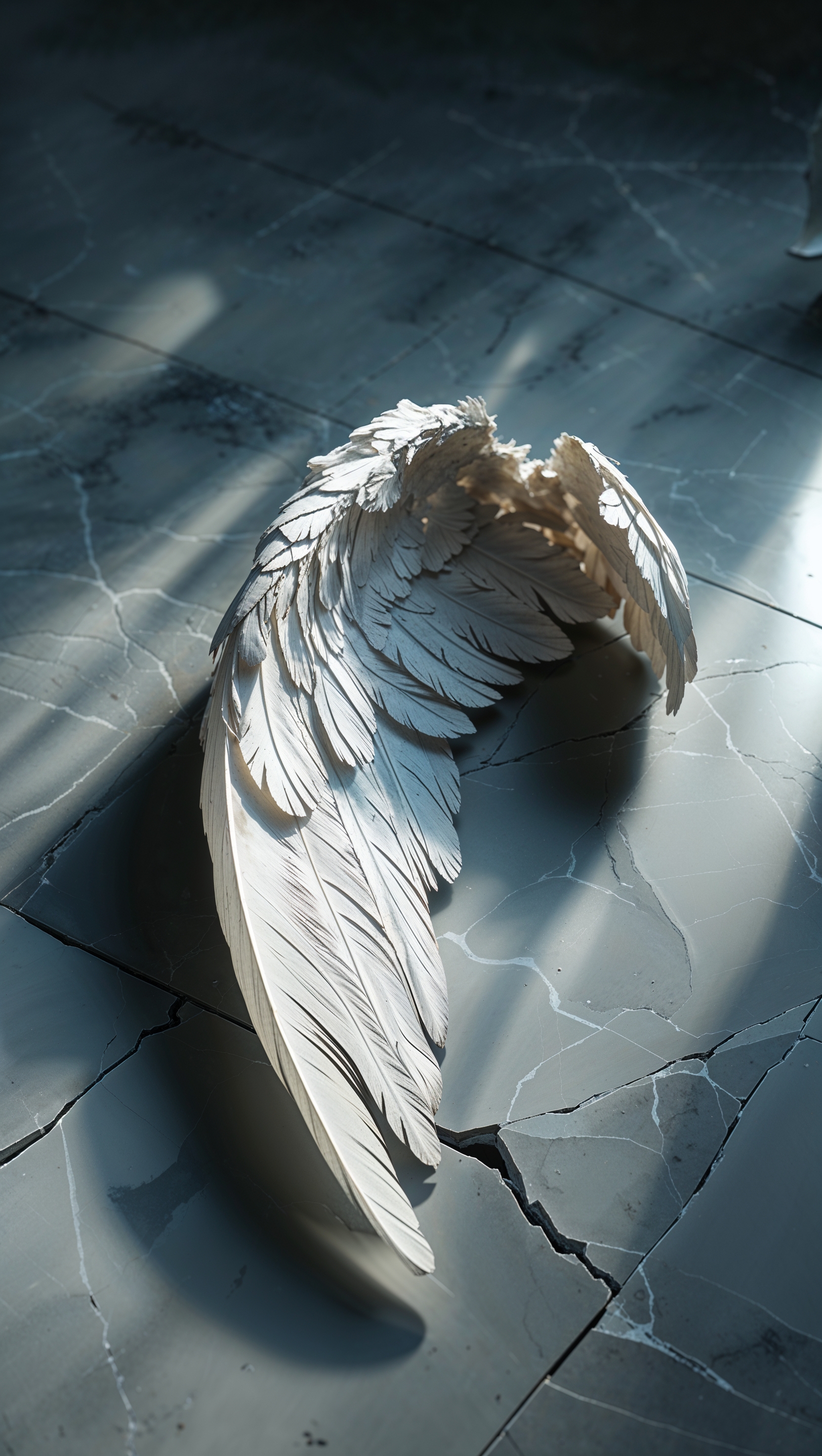 1664x2944 A cracked angel wing on a cold marble floor, symbolic sadness, iPhone wallpaper